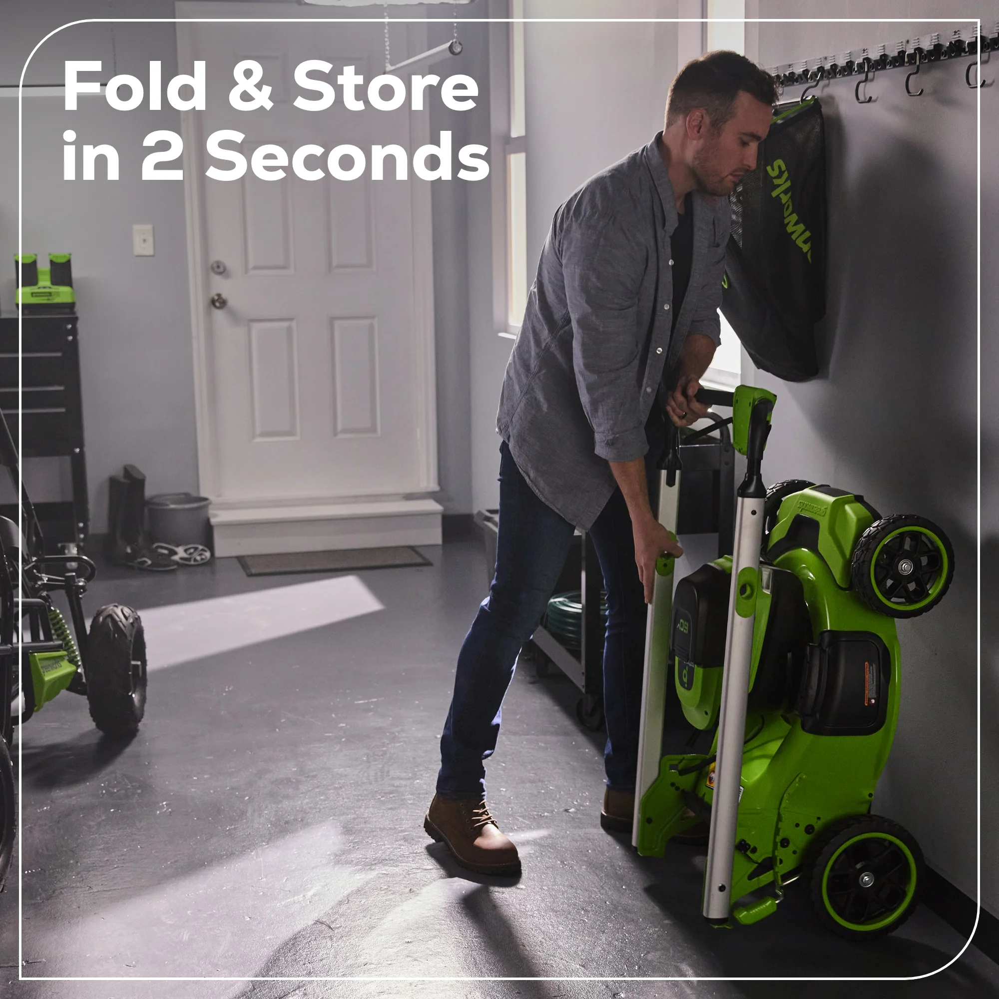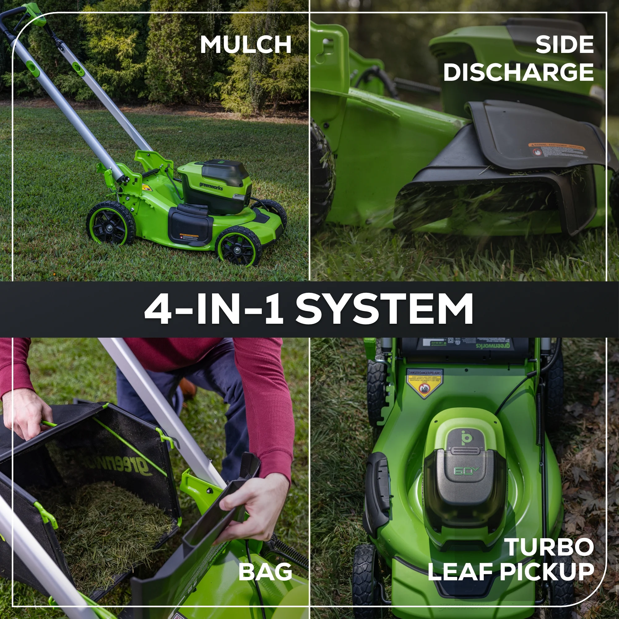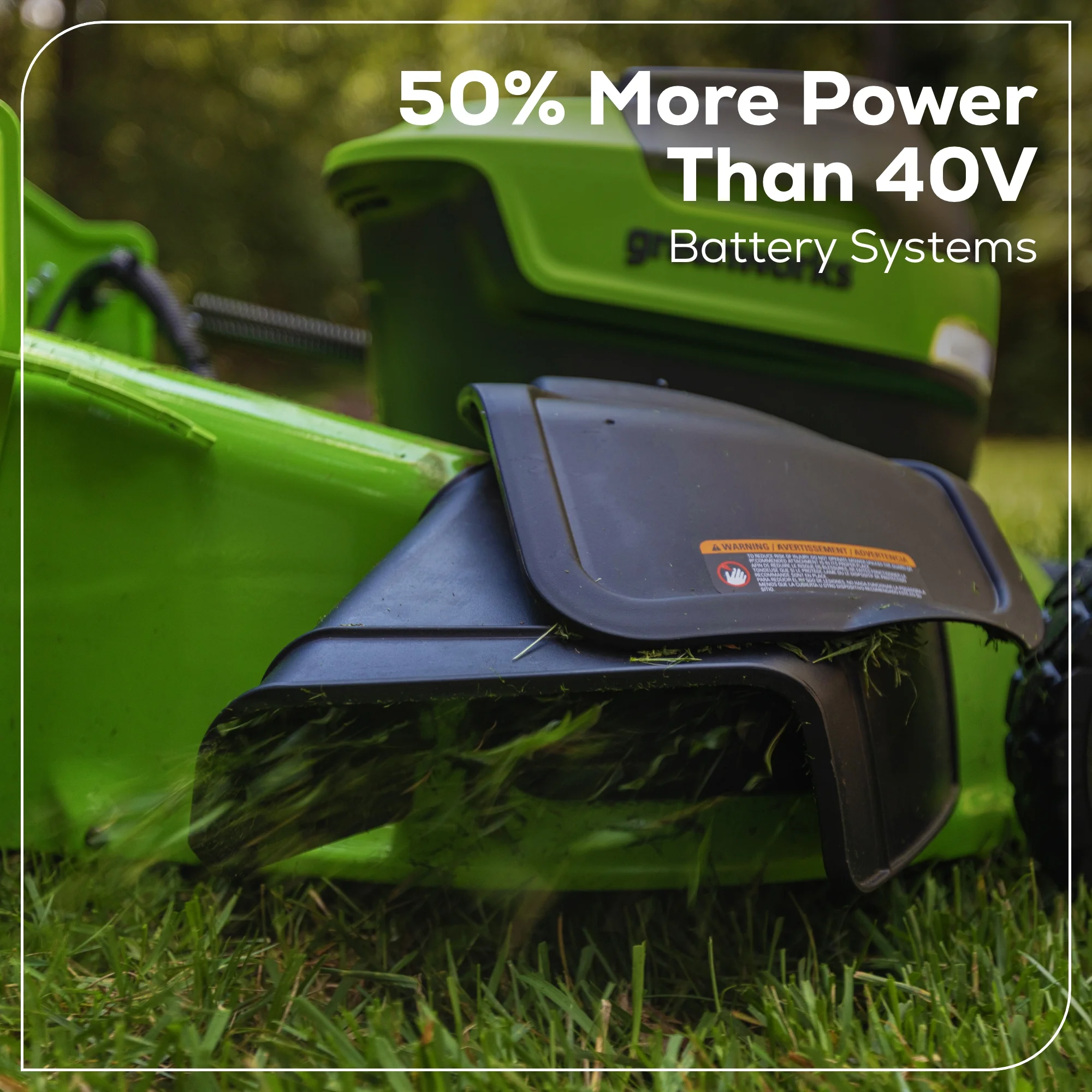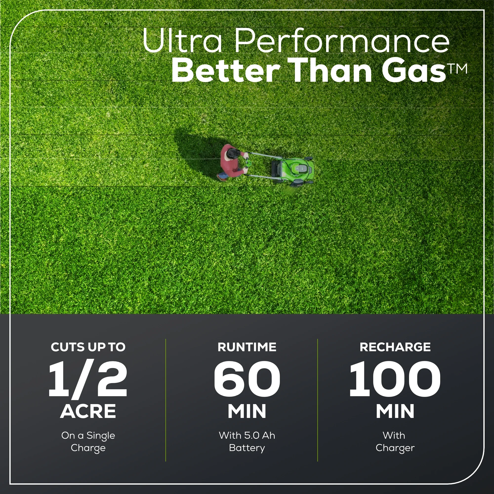 Replace dangerous emissions, smells, hassles, and maintenance with Greenworks 60V 21" Battery Powered Push Lawn Mower. The intelligent brushless motor technology provides constant, fade-free power equivalent to 150cc gas powered lawn mowers. Lawn mower mows up to 0.5 acres on a single charge, and battery fully recharges in just 100 minutes. The heavy-duty steel cutting deck with eight-position, single-lever cutting height adjustment provides maximum airflow for excellent cuts, and features our four-in-one design for mulching, side discharge, or bagging, with added turbo button for better lift when picking up leaves. With hassle-free, push button start, you'll get to work fast, with no priming, no choke, and no pull cord. Other features include LED headlights, oversized 10" rear and 8" front tires, and EZ Fold handles for space-saving vertical storage. Includes 5.0 Ah lithium-ion battery NS charger. Battery is compatible with 75+ Greenworks Pro 60V products.