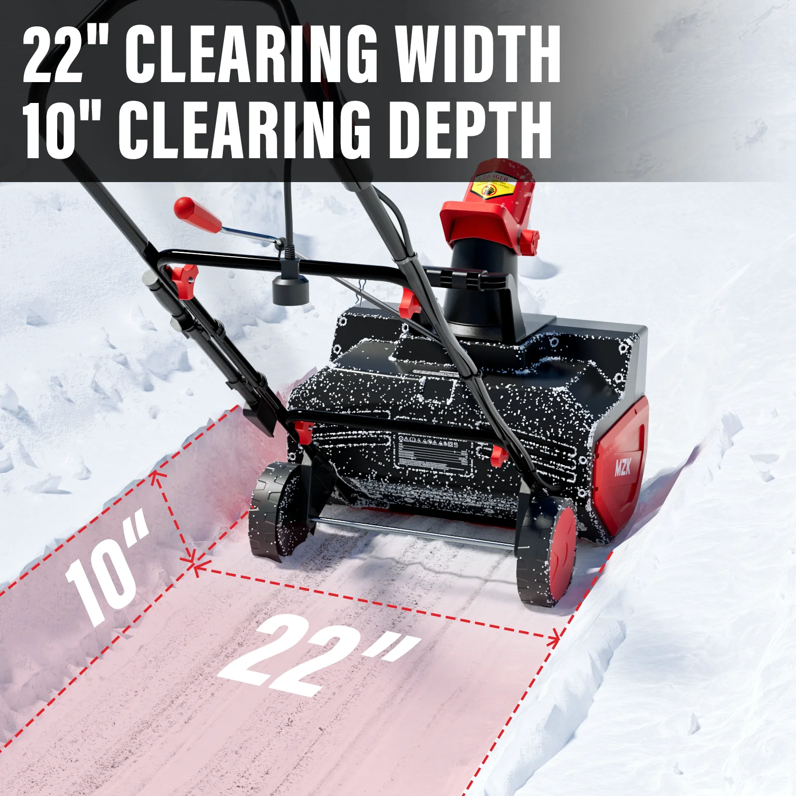 - EFFICIENT SNOW REMOVAL: With a 23" clearing width, 13" snow depth, and a 30'' throwing distance, MZK snow blower tackles snow with ease, clearing your driveway or sidewalk in no time.