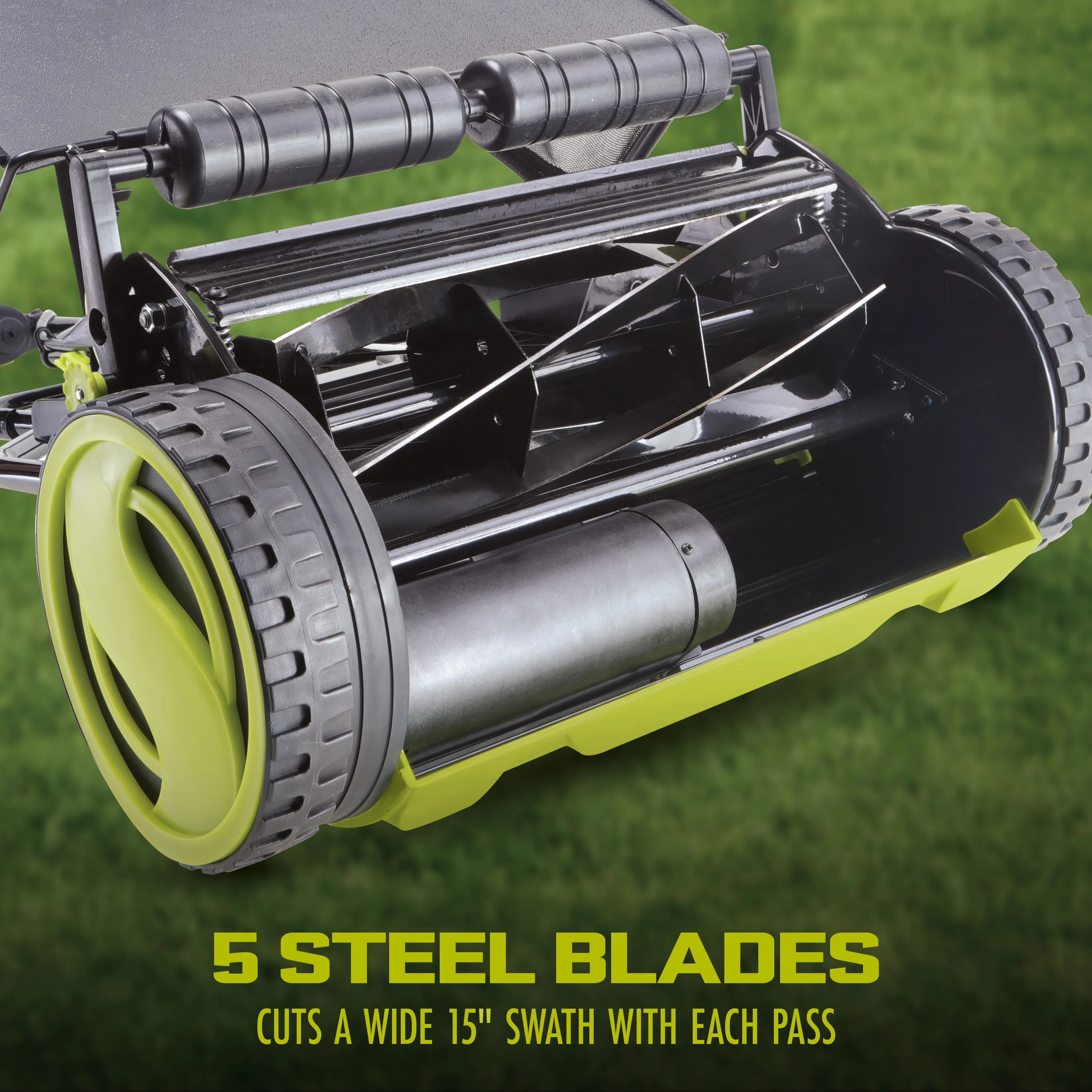 - Features a 15-inch, 5-blade RAZOREEL system that lifts and cuts each blade of grass for a clean, even trim.