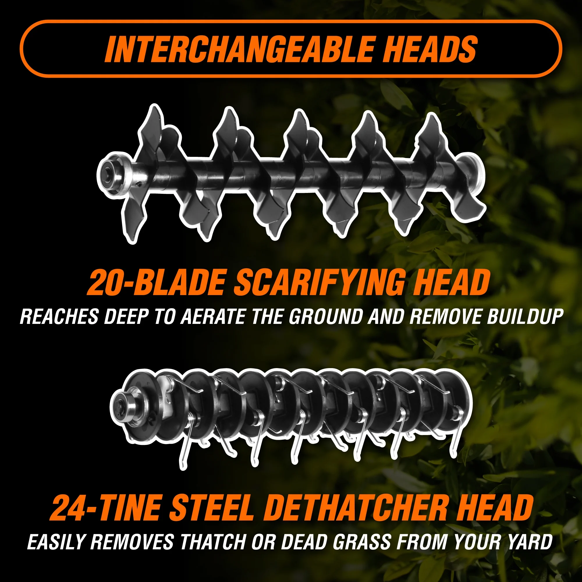 - Includes both scarifying and dethatching heads for versatile lawn care
