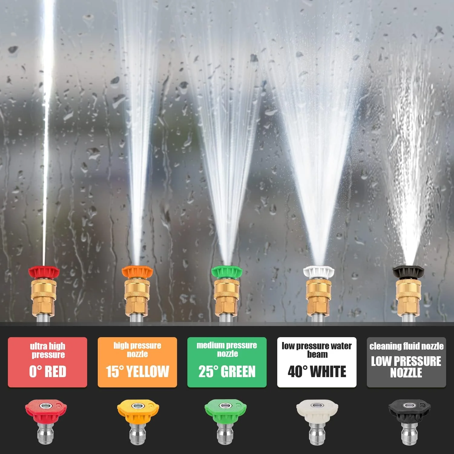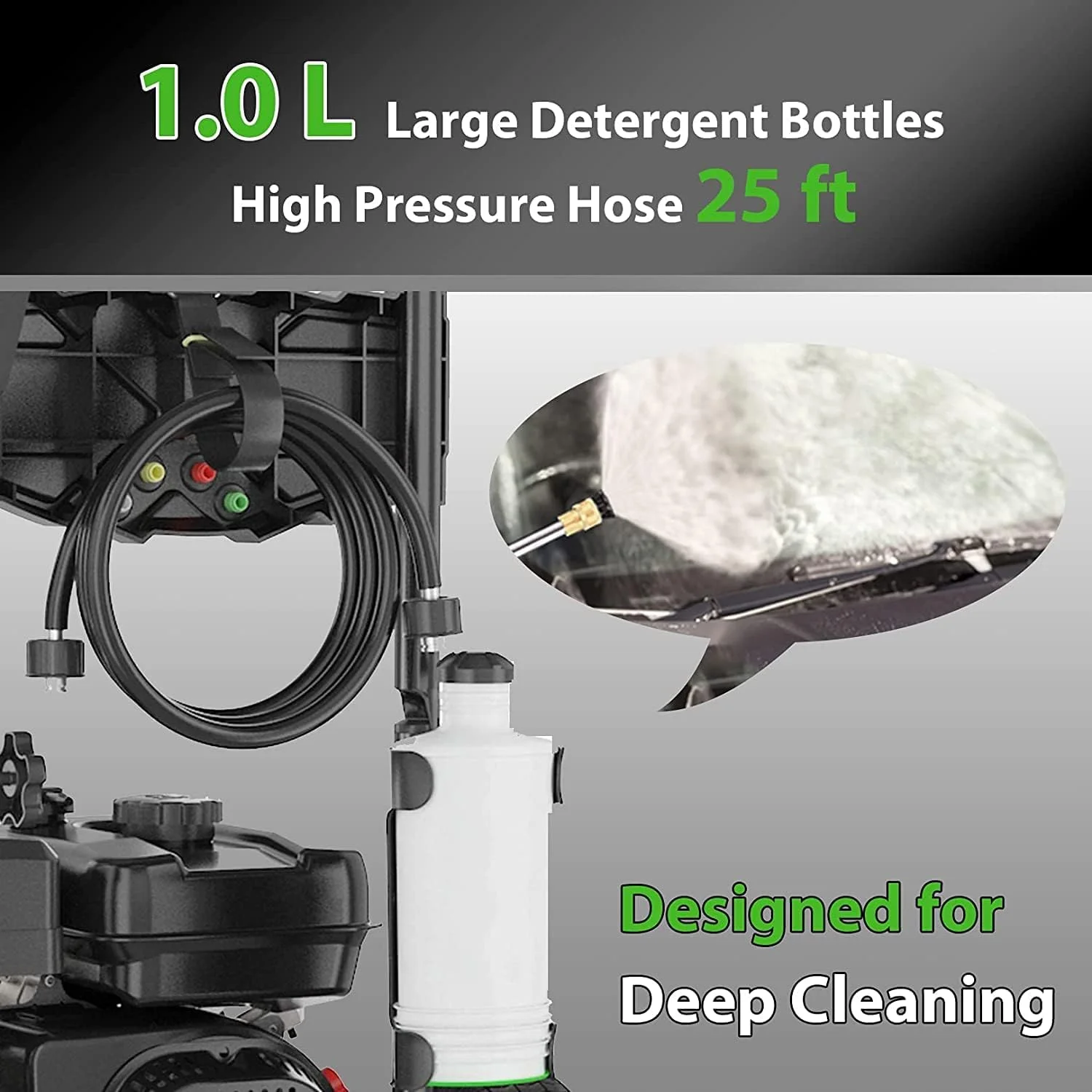 - Versatile Cleaning Options: The pressure washer includes 5 quick-connect nozzles (0o,15o, 25o, 40o, 60o, and soap) to tackle different cleaning tasks, such as porches, driveways, patios, and even vehicles, providing flexibility for various cleaning needs.1L soap tank with adjustable switch-use to spray soaps and detergents.