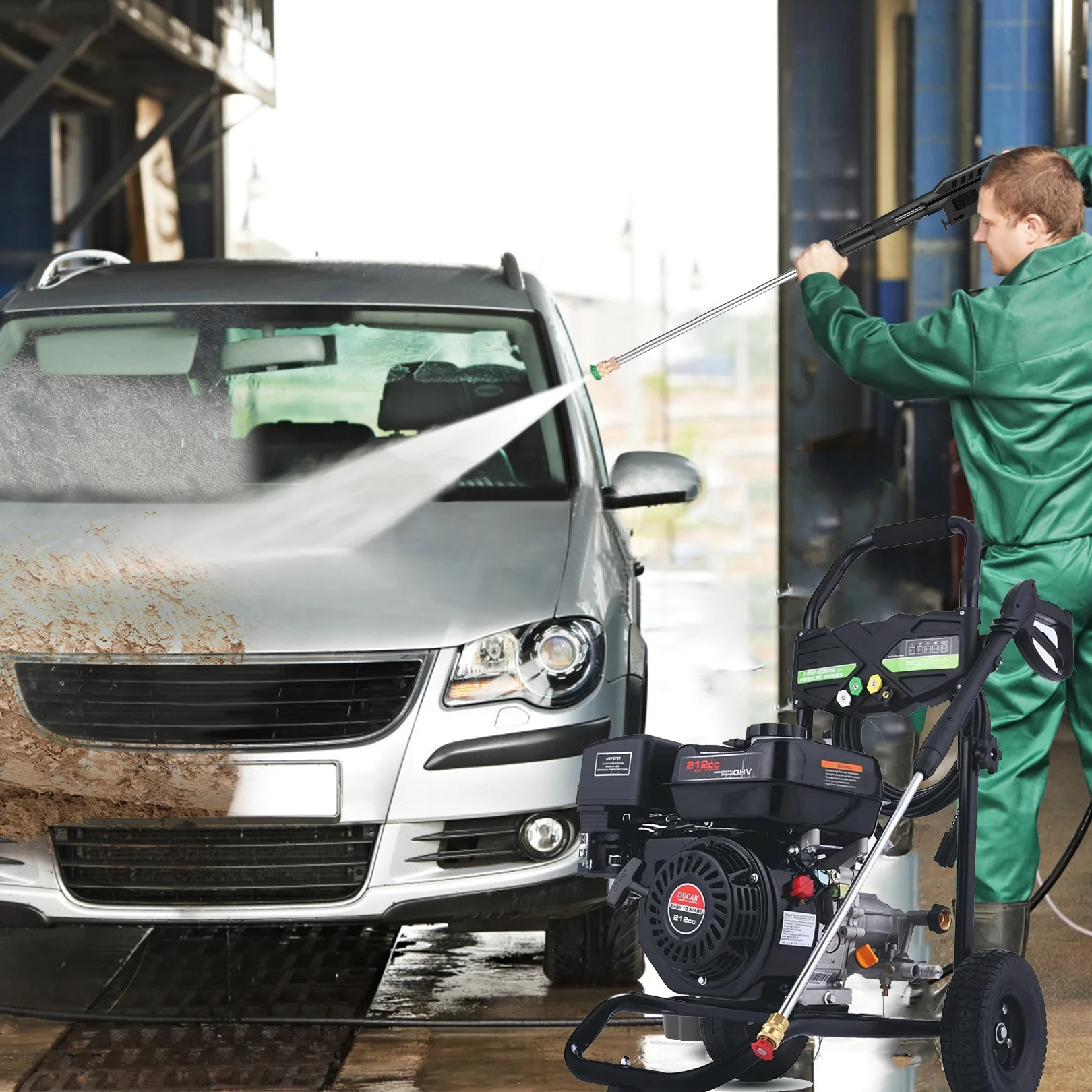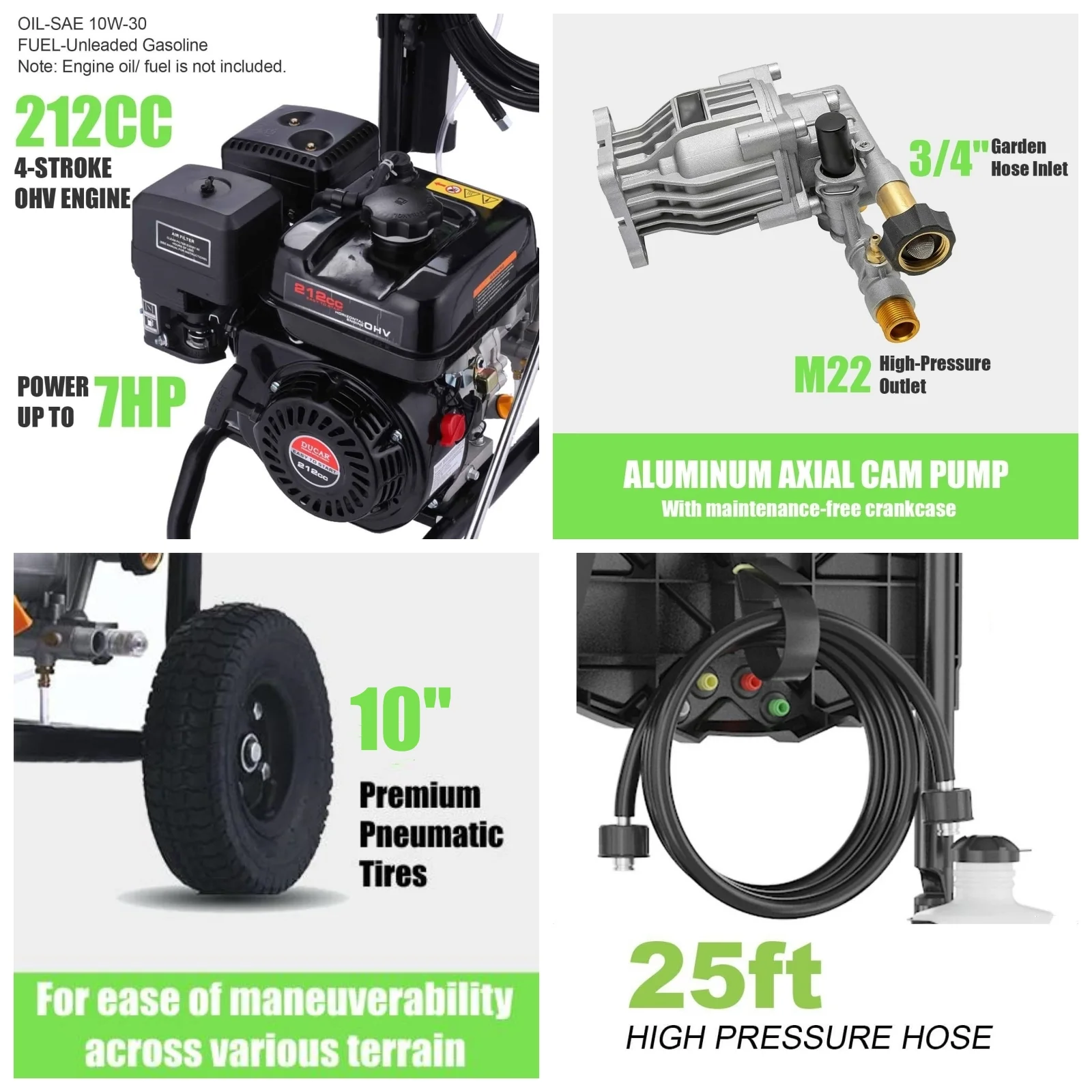 - Efficient Gasoline Engine:This gas pressure washer is powered by a rugged 7HP 4-stroke 212cc gasoline engine and recoil start system,it is paired with a durable axial cam pump,which is highly reliable and designed for heavy workloads,not only powerful,but also easy to start and with minimal maintenance costs,ensuring years of continuous operation,and factory integrity testing to ensure reliable performance.CARB compliant.Cleaning power is 100% higher than electric pressure washer.