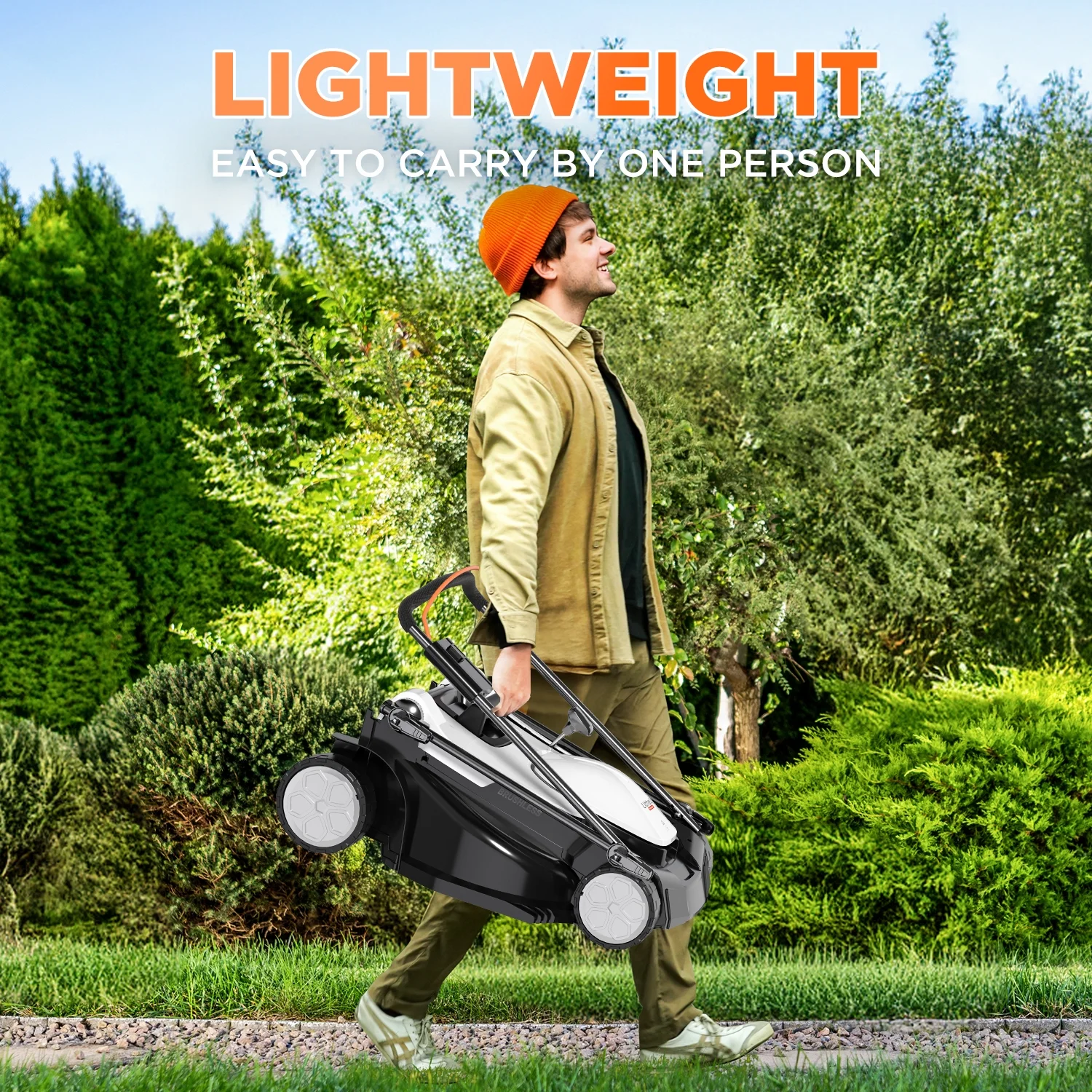 - Weighing only 26.5 lbs, this cordless lawn mower is lightweight and easy to push, making it a breeze to maneuver around your lawn.