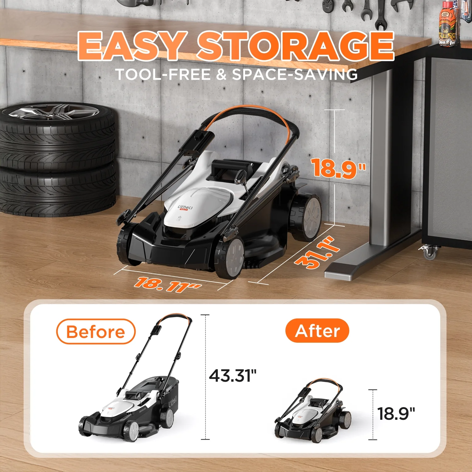- The foldable handle allows for minimal storage space, making it convenient to store the lawn mower when not in use.