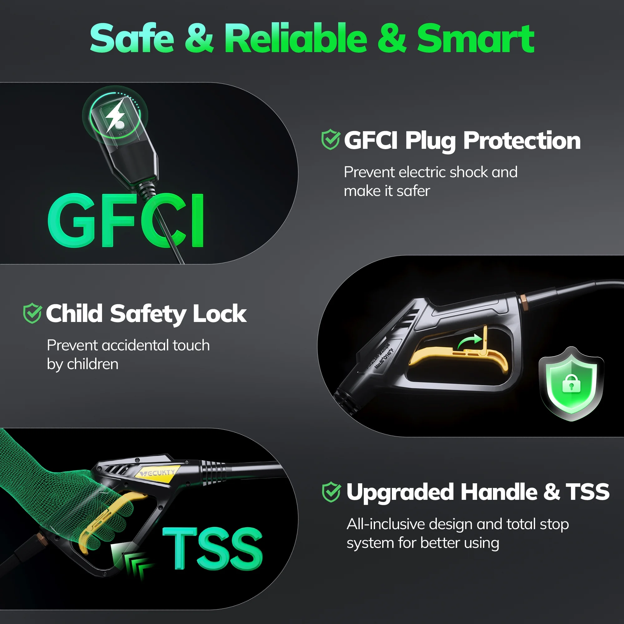 ? Smart Energy Savings: Built-in TSS (Total Stop System) automatically shuts off the pump when the trigger is not engaged to save energy and prolong the service time of the electric power washer. A press-type security lock prevents the spray gun from being engaged accidentally.What's more important! Our plug features built-in leakage protection to significantly reduce risks