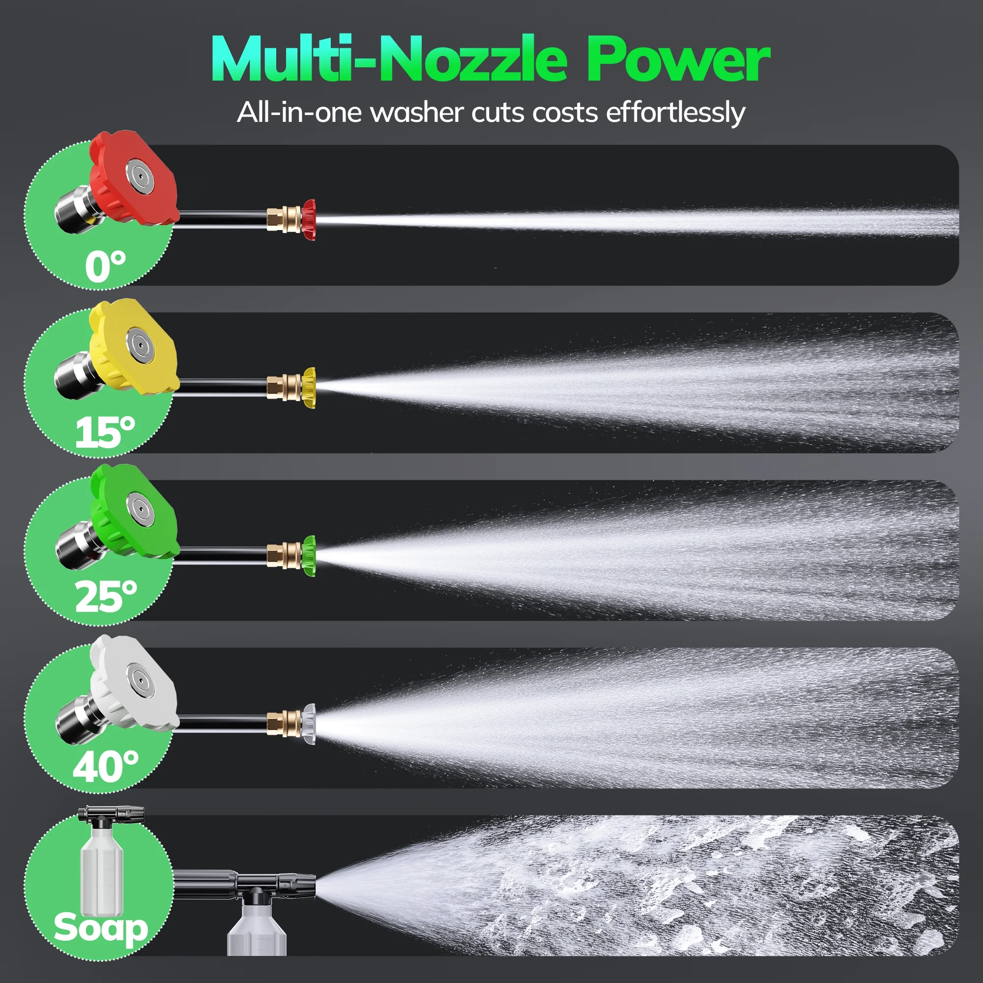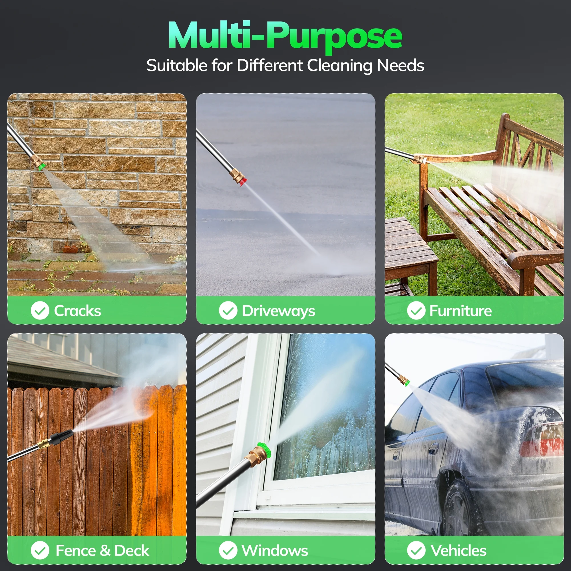 ? Versatile Cleaning: Our pressure washer comes with 4 interchangeable spray nozzles (0��, 15��, 25��, 40��) to suit different cleaning tasks. Use the 0��nozzle for intense spot cleaning, 15��for tough surfaces like driveways, 25��for general use, and 40��for delicate surfaces like windows or vehicles. Switch nozzles in seconds with the quick-connect system.