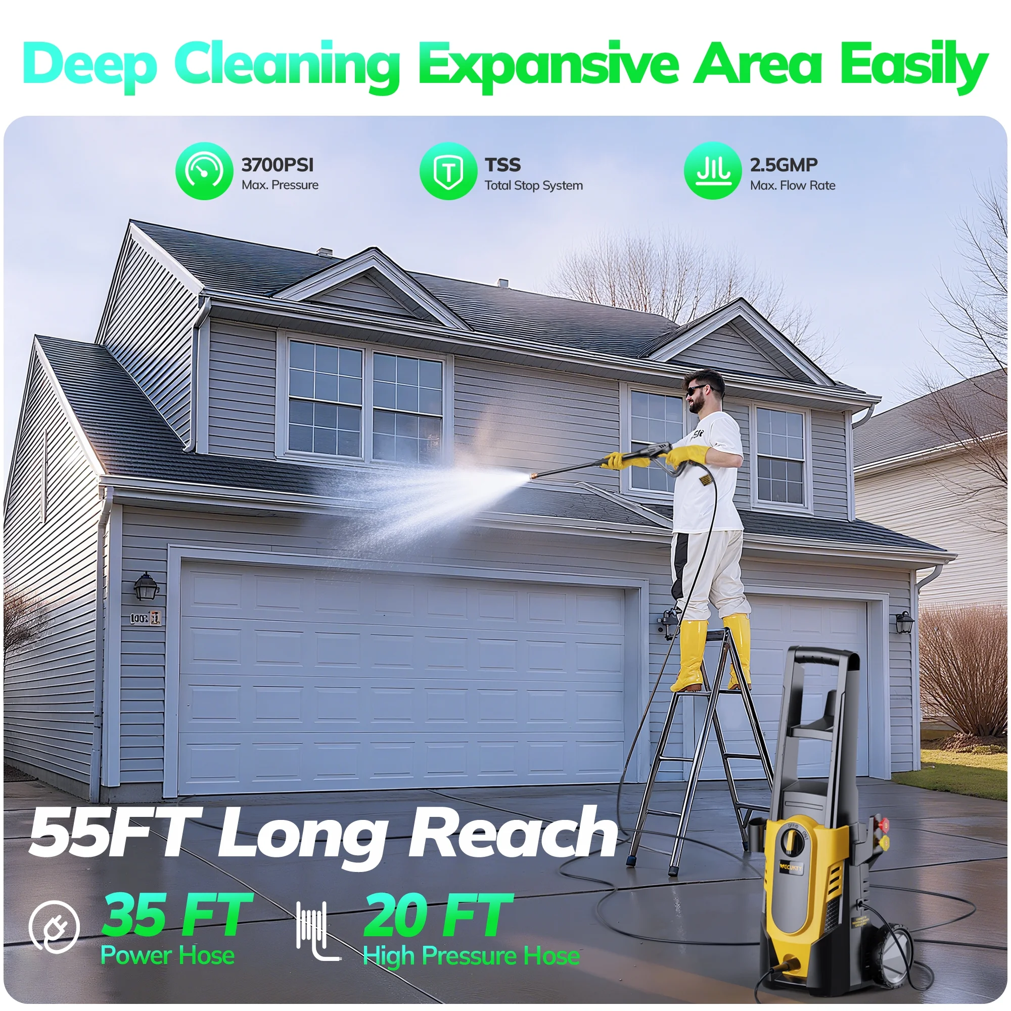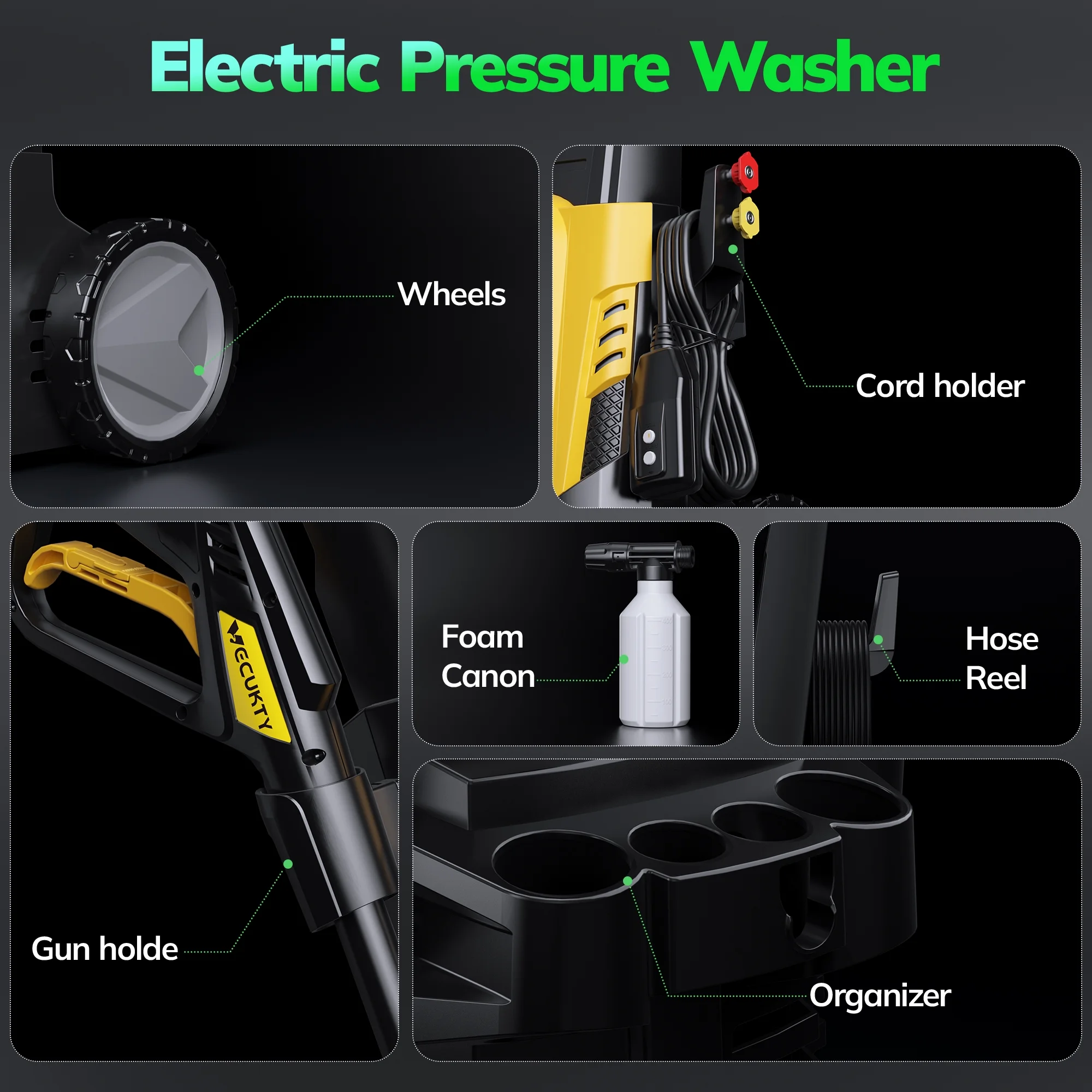 Unleash the power of VECUKTY's electric pressure washer �C designed to conquer stubborn grime with a 35FT power cord and 20FT hose for unbeatable range. Effortlessly switch between 4 spray nozzles (0��-40��) to blast driveways, gently wash cars, or tackle any cleaning challenge. Its built-in foam cannon cloaks surfaces in thick suds for deep cleaning, while the smart TSS system saves energy and prevents accidents. Quick to assemble, built to last, and backed by a 1-year warranty �C your shortcut to cleaner, faster.Sparkling results start here! Unleash the power of VECUKTY's electric pressure washer �C designed to conquer stubborn grime with a 35FT power cord and 20FT hose for unbeatable range. Effortlessly switch between 4 spray nozzles (0��-40��) to blast driveways, gently wash cars, or tackle any cleaning challenge. Its built-in foam cannon cloaks surfaces in thick suds for deep cleaning, while the smart TSS system saves energy and prevents accidents. Quick to assemble, built to last, and backed by a 1-year warranty �C your shortcut to cleaner, faster.