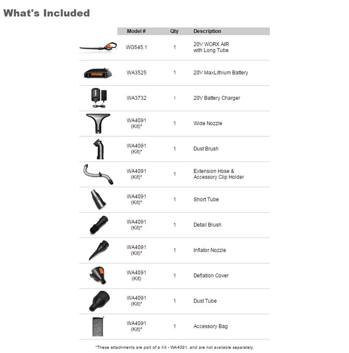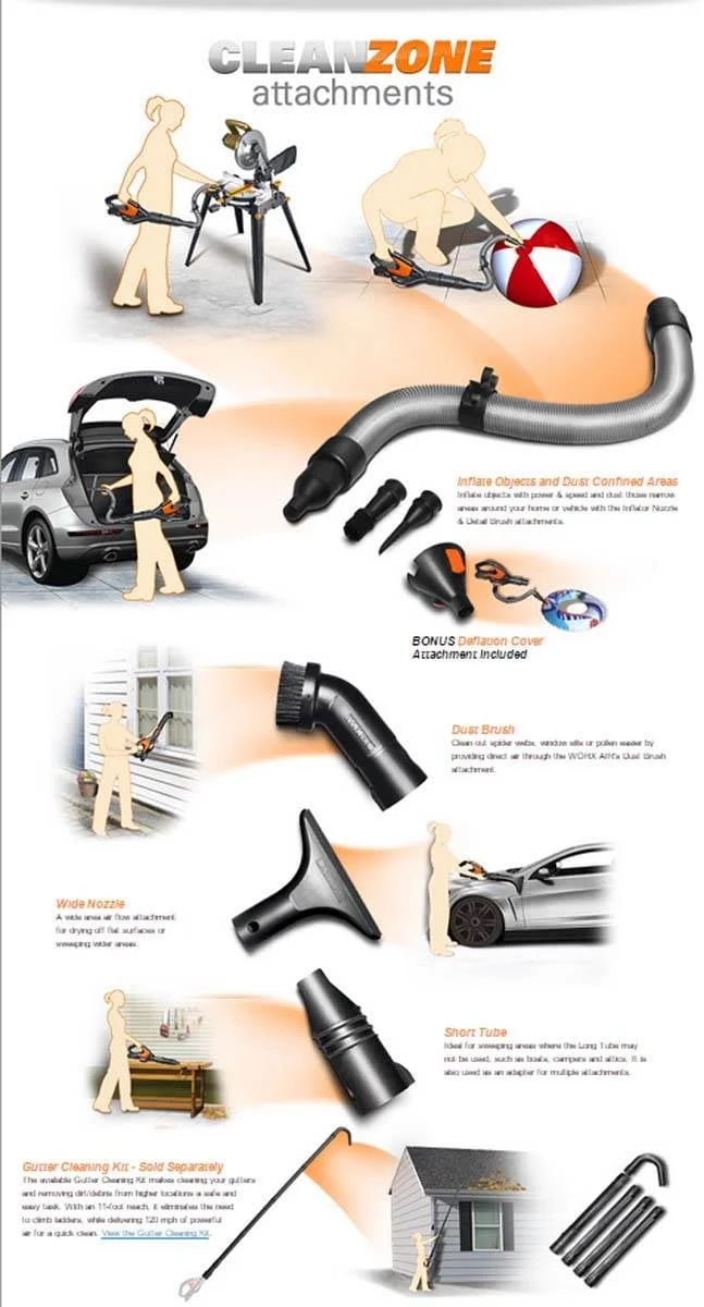 - 8 CLEANING ATTACHMENTS - Indoors or out, the Worx Air and attachments are great for cleaning everything from lawn furniture to keyboards