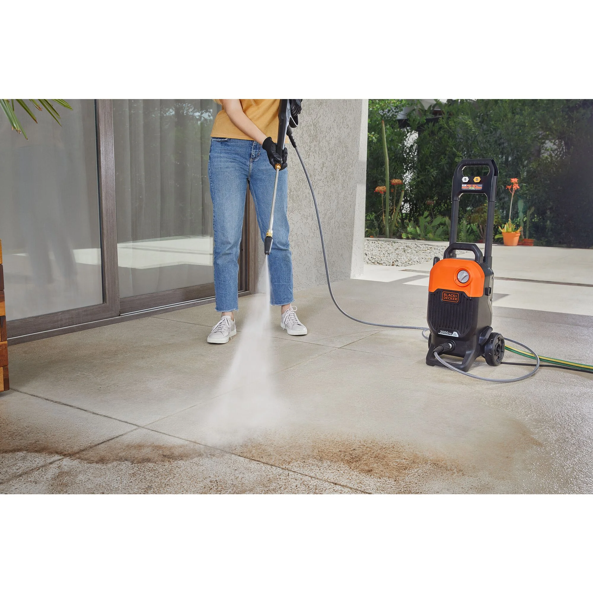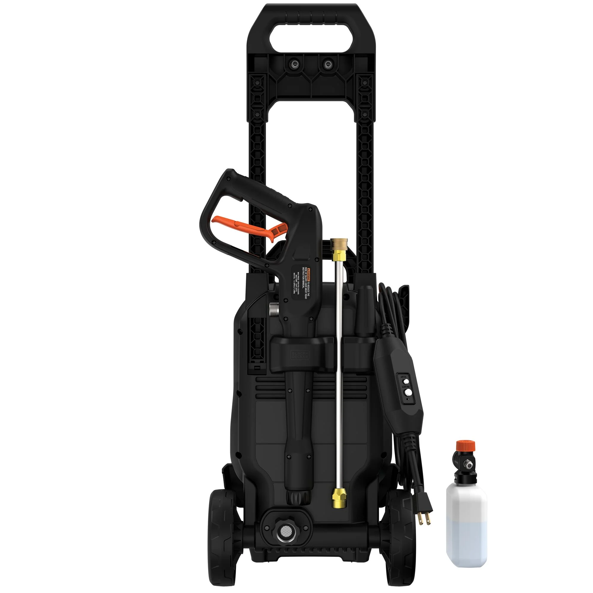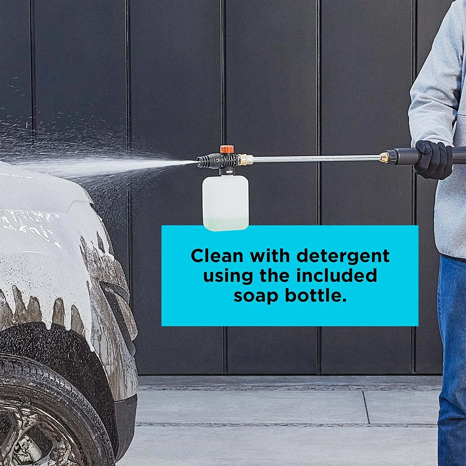 This 2,000 MAX psi 1.2 gpm Electric Cold Water Pressure Washer helps complete outdoor cleaning tasks from sidewalks and decks to washing cars. Easily move around from project to project with its convenient telescoping handle and 6 in. wheels and take advantage of 35% space saving by closing the Corded Pressure Washer when stored. Keep your accessories and attachments organized with an integrated storage system that allows you to stow the hose, wand, power cord, turbo nozzle, 15-degree nozzle, and 40-degree nozzle on board. Quickly tackle large chores with the turbo nozzle, which delivers up to 145% more cleaning width, and clean with detergents using the included soap bottle. Designed to extend motor life, the pressure washer features an automatic shut-off function, activated when the trigger is released.