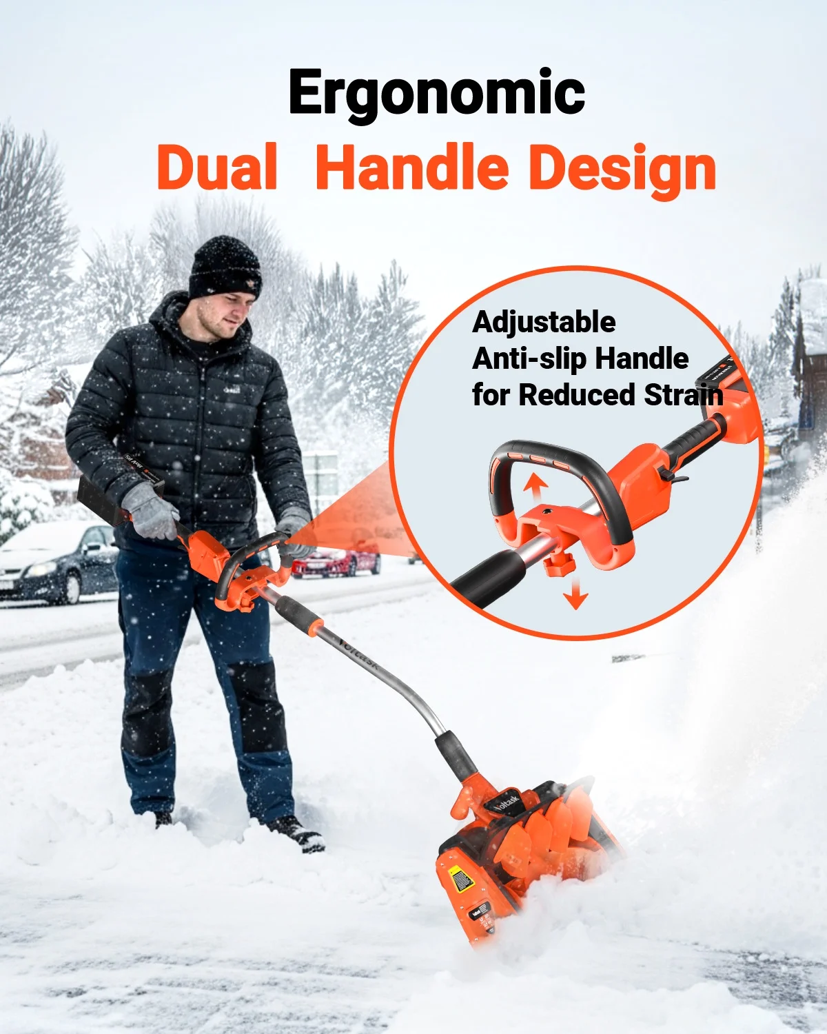 - ERGONOMIC & SAFE - To make each snow removal session easier and back-friendly, Voltask has incorporated ergonomic adjustments into the design of every product. Additionally, our power shovel features an adjustable handle that can be set to various angles and heights, allowing you to find the most comfortable gripping position. And a dual safety switch designed to reduce the risk of accidents.