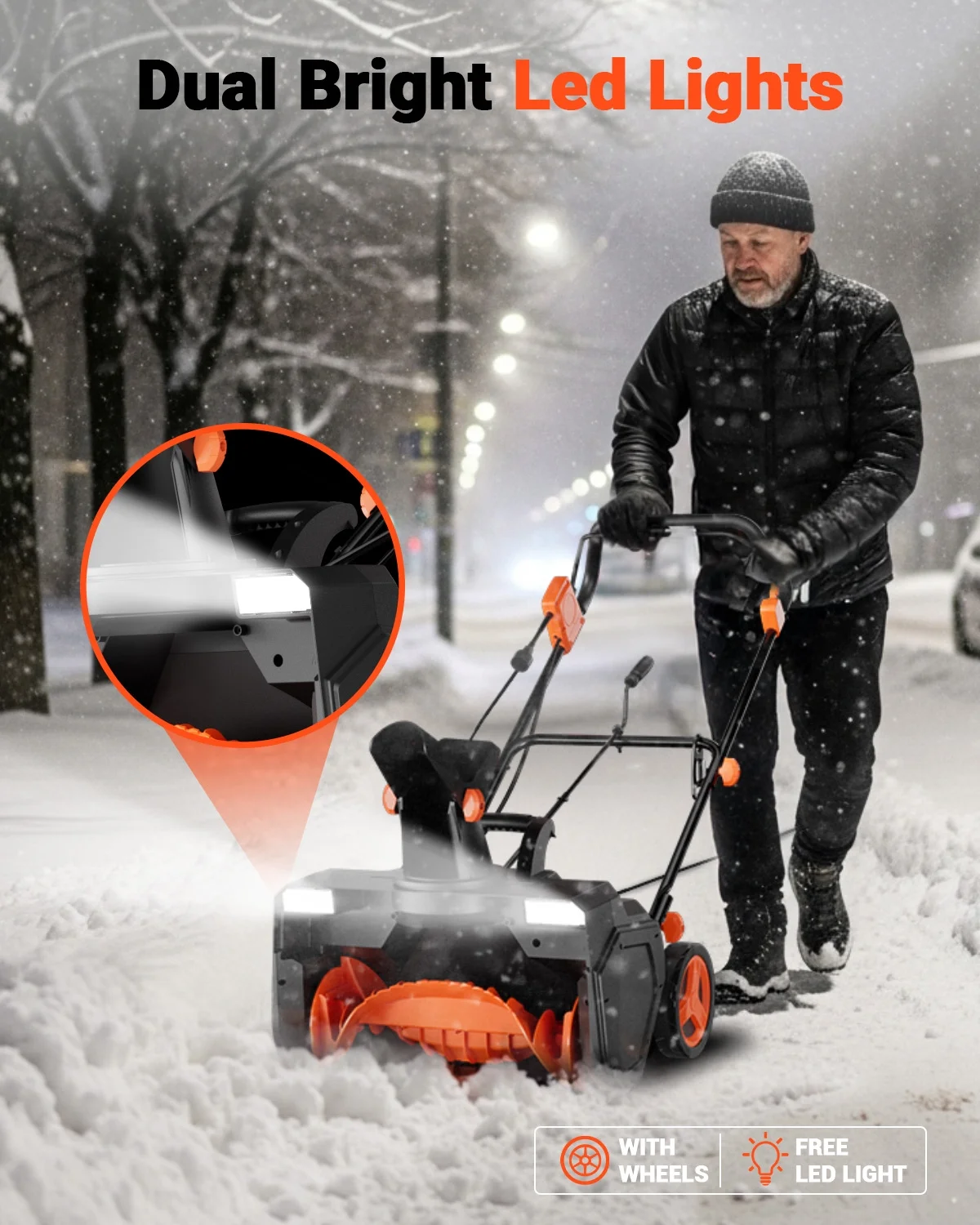 - HIGH MANEUVERABILITY & DIRECTIONAL CHUTE - This snow blower is equipped with smooth wheels and dual LED lights, ensuring that you can easily complete the snow removal tasks both day and night. Moreover, our electric snow blower is equipped with a 180-degree directional chute, enhancing its flexibility. It can throw snow up to 25 feet, allowing you to easily choose the discharge location and handle various snow removal scenarios.