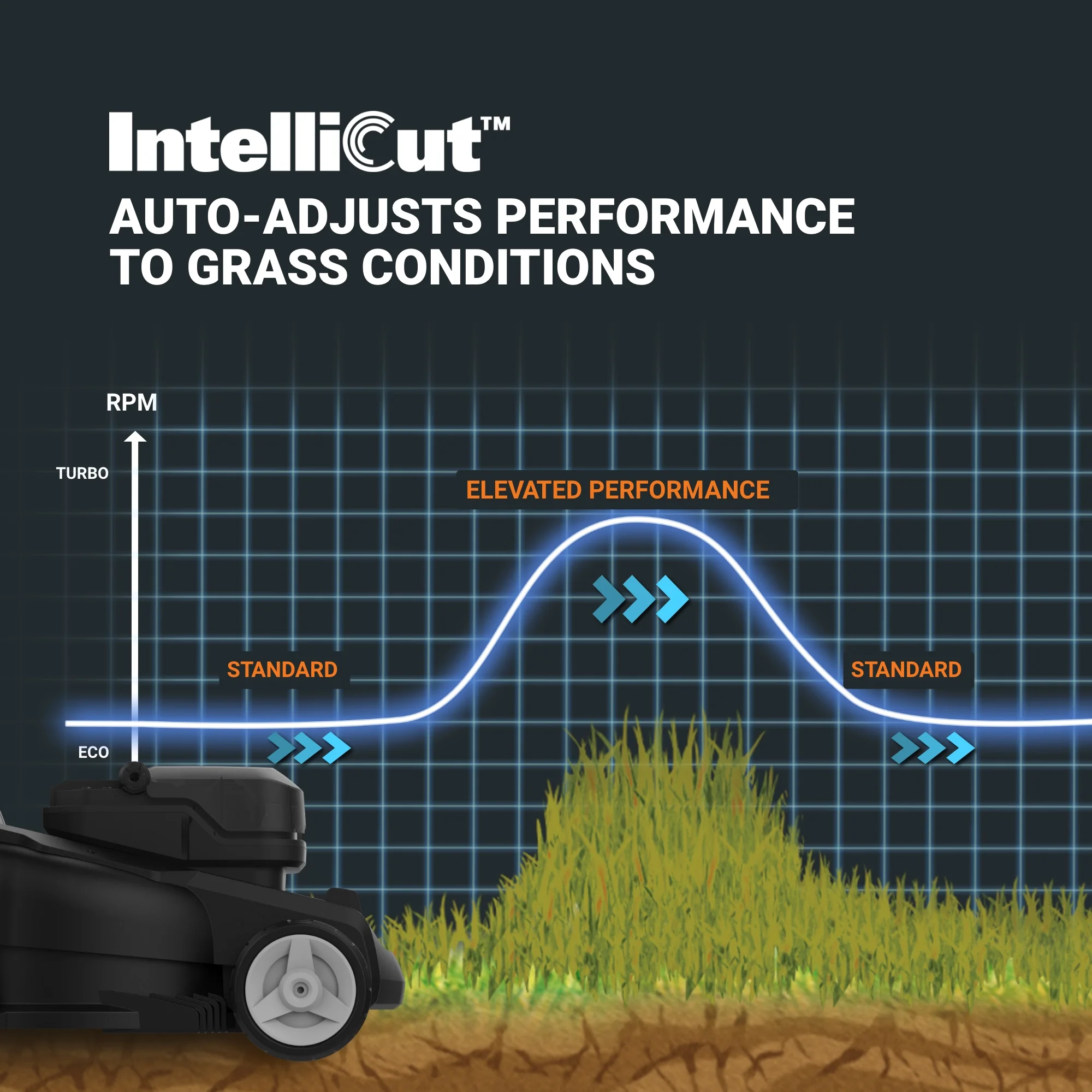 - INTELLICUT TECHNOLOGY: Built with patented sensors, this lawn mower automatically dials up the cutting speed to power through thick grass, and dials it back to conserve energy in less-dense areas