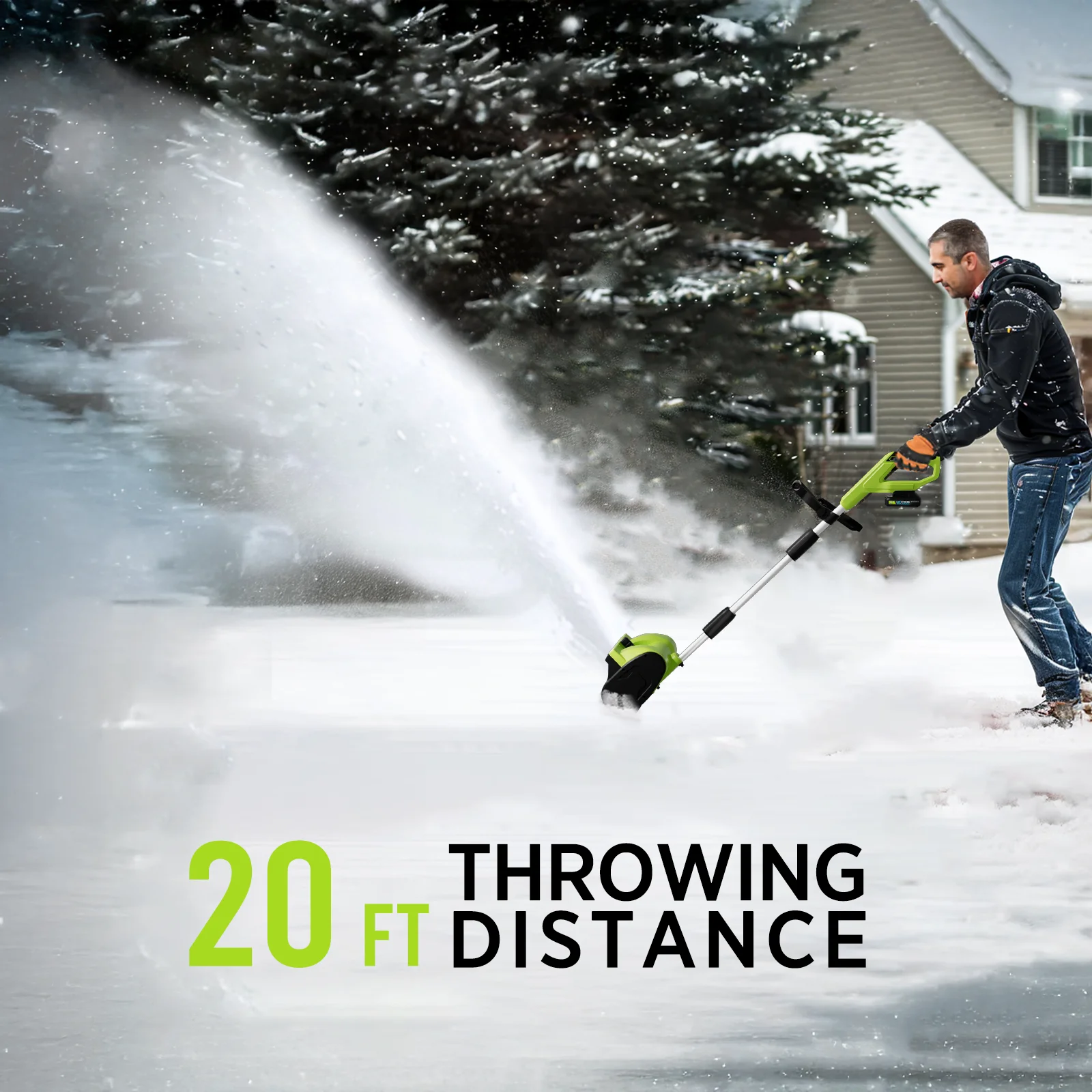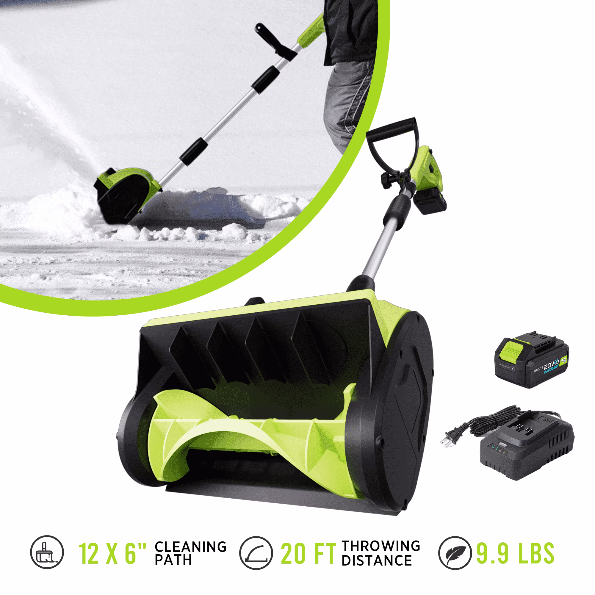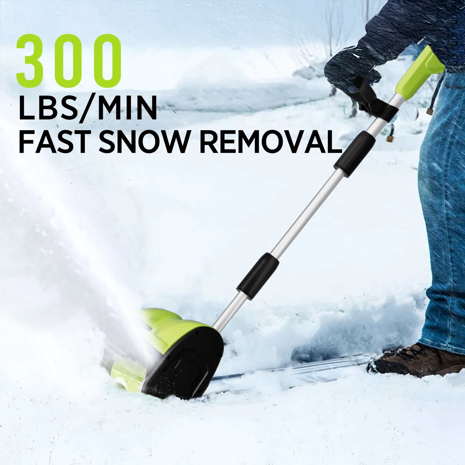 - ��Lightweight &Powerful�� This electric snow shovel weighing only 9.9 pounds, makes it easy to carry around. Its 21V 4.0Ah battery throws snow up to 20 feet, clearing 300 lbs per minute for fast, efficient snow removal.