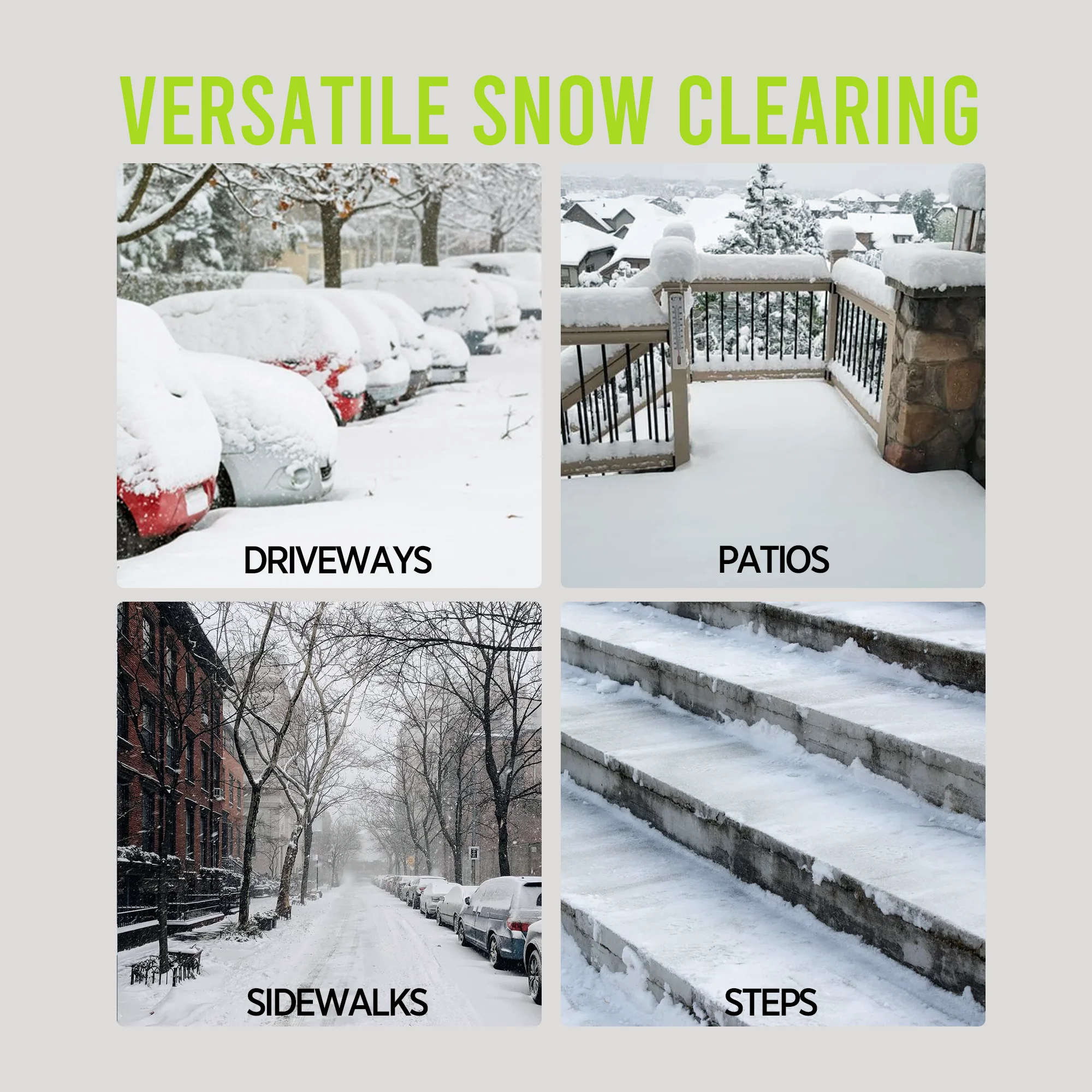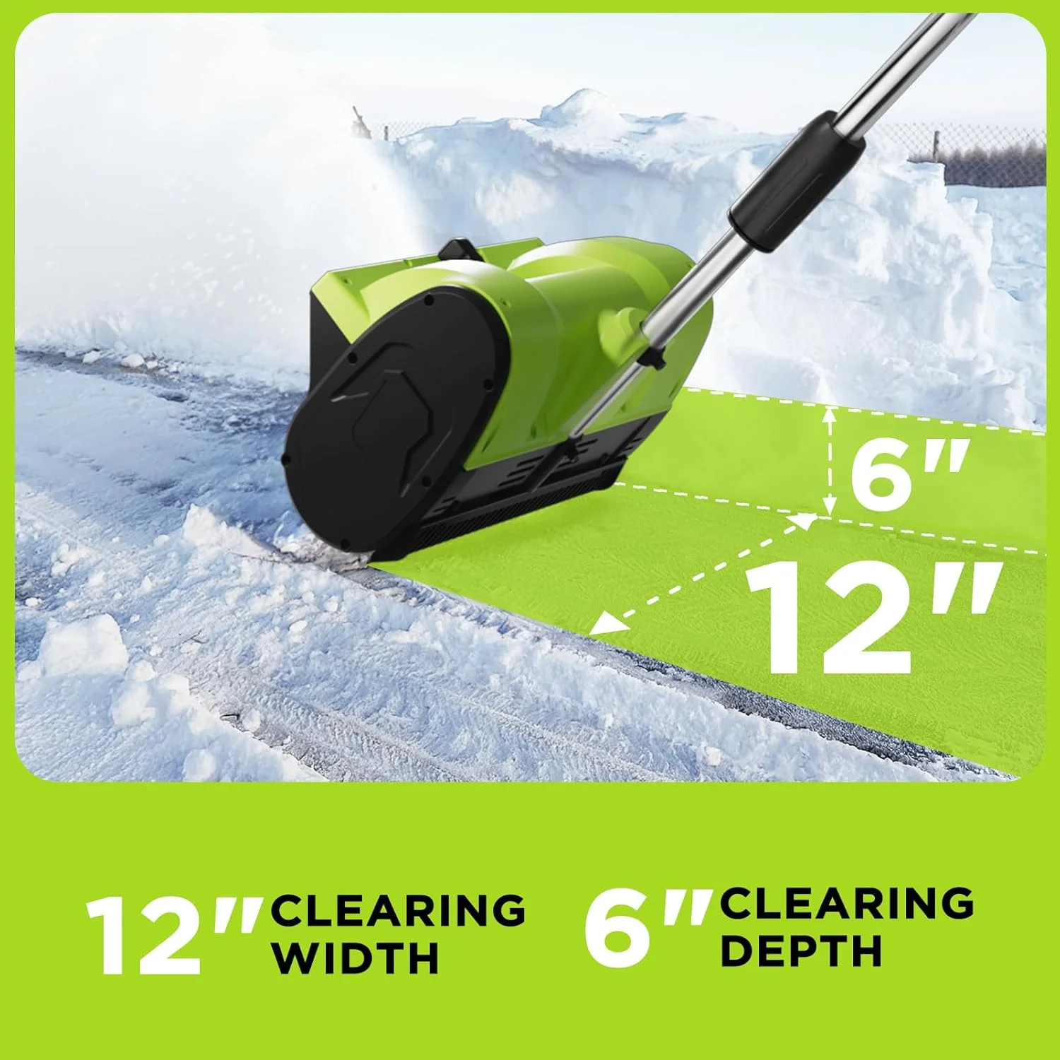 - ��Versatile &Quiet��With a 12-inch clearing width and 6-inch depth, this snow thrower is ideal for driveways, sidewalks, patios, and more. Its quiet operation makes it perfect for residential use without disturbing neighbors.