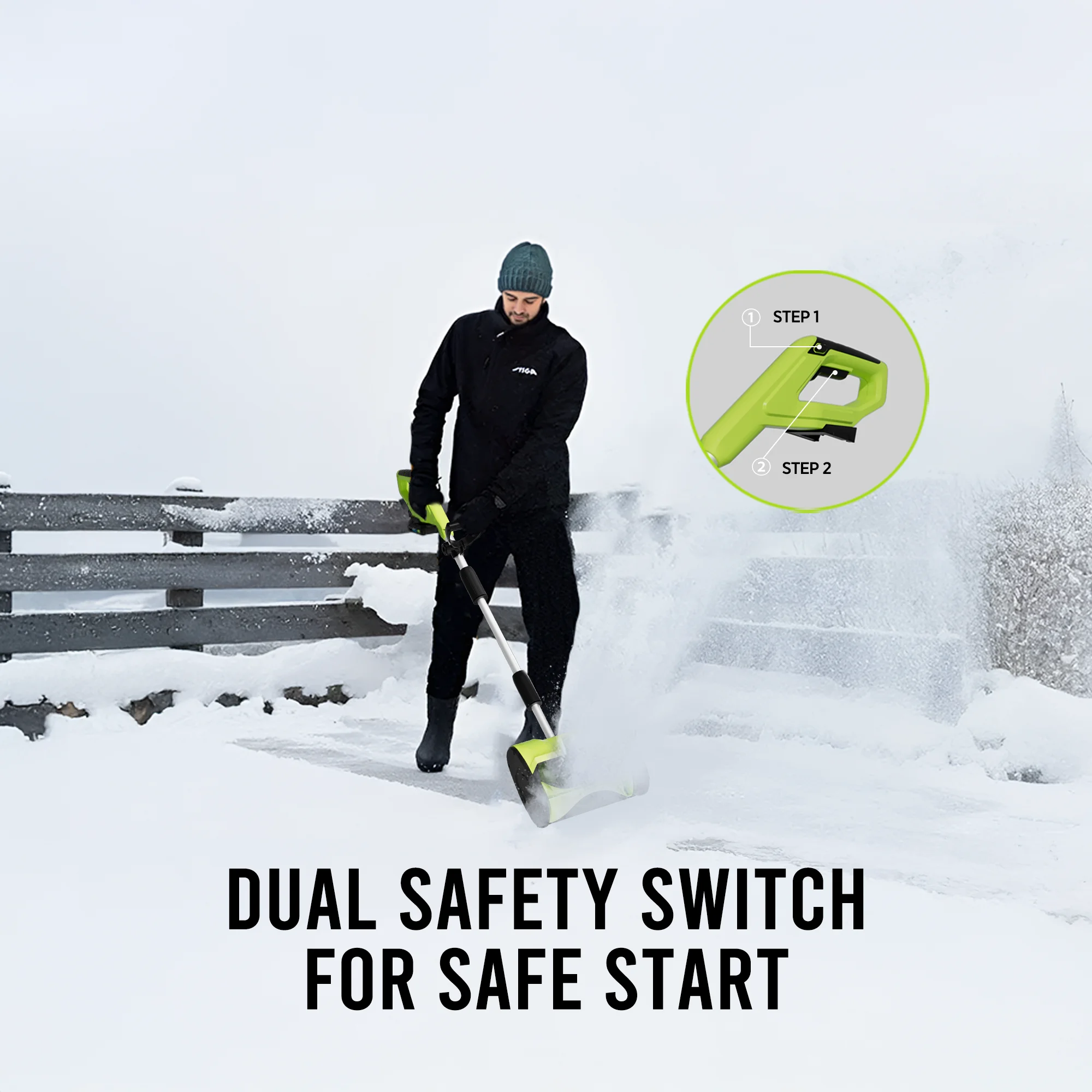 - ��Ergonomic & Safe��The ergonomic handle can be set at different angles and heights,so the user can find the most suitable grip position supports your back while you clear snow comfortably. Dual-action starting protects the user from accidental activation.