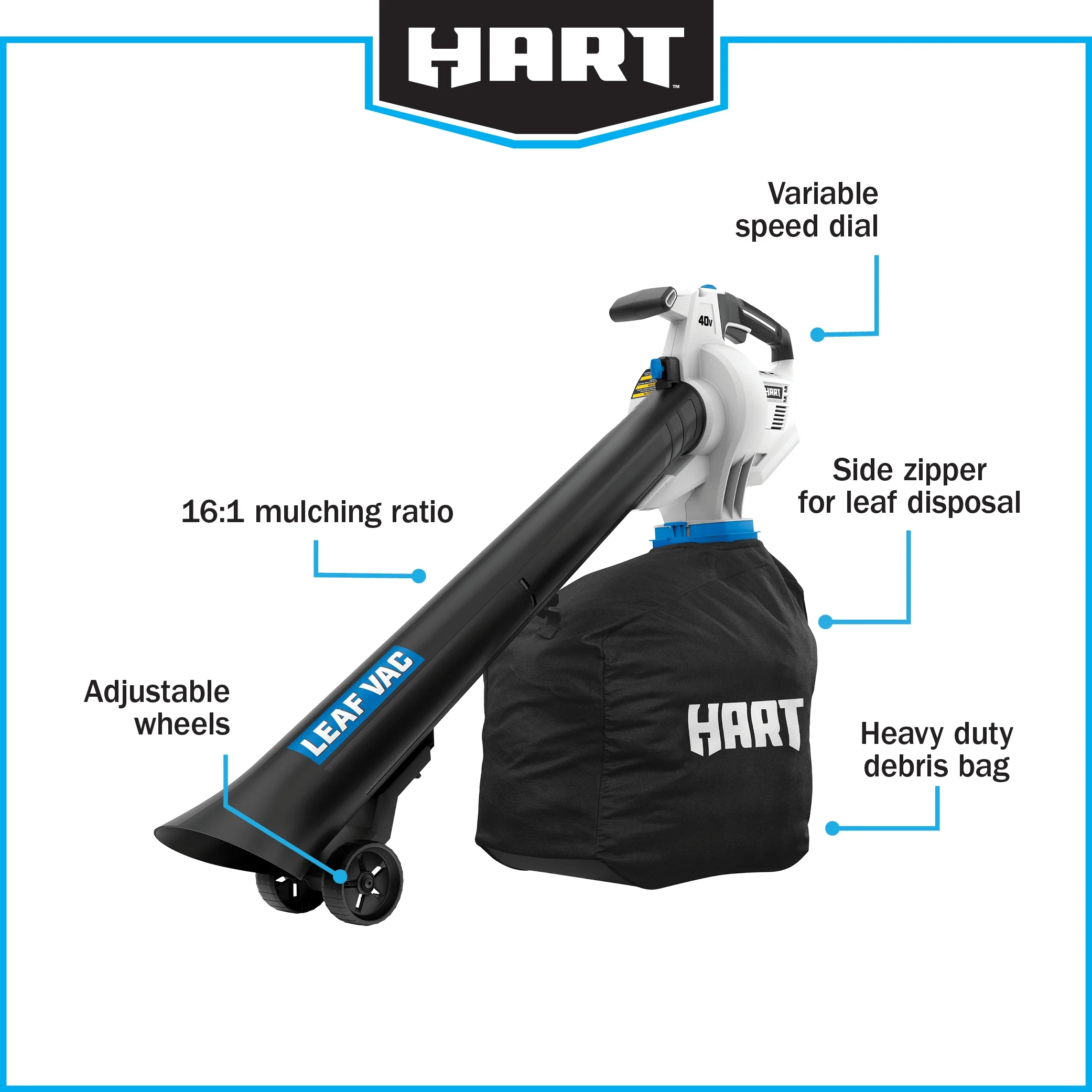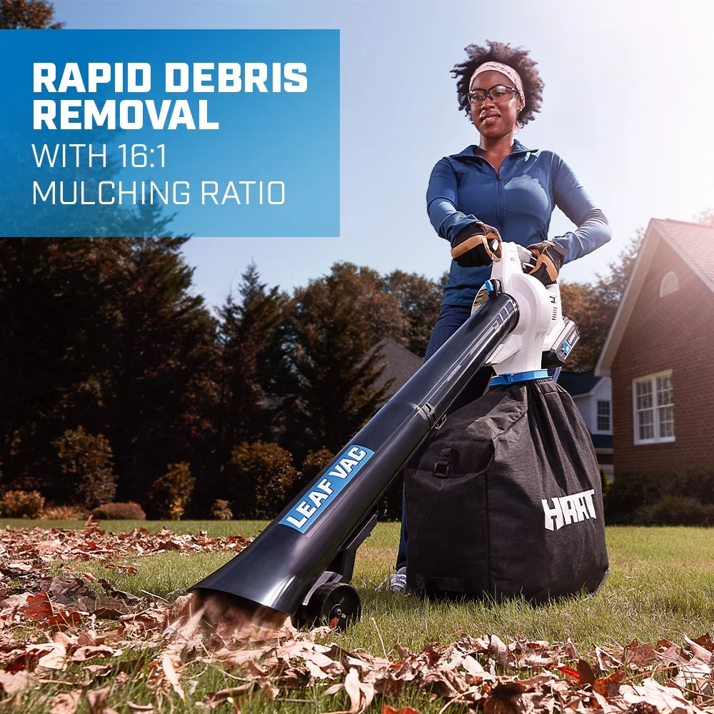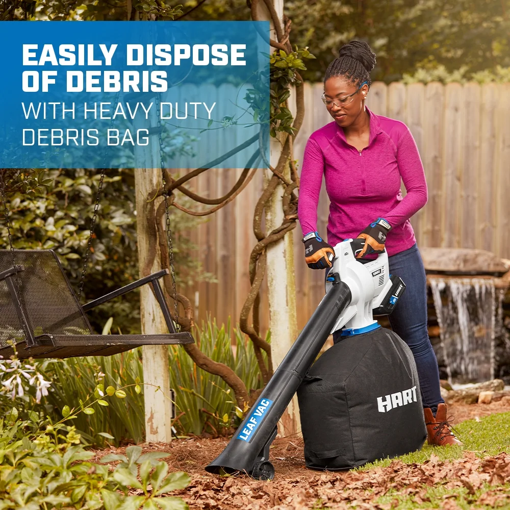 - Heavy-duty debris bag with side zipper for easy leaf disposal