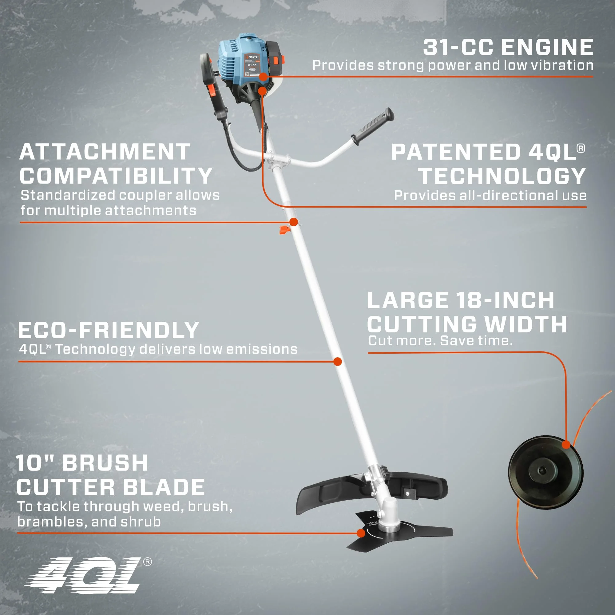 The SENIX Petrol Straight-Shaft Lawn Mower and Brush Cutter features a lightweight 4-stroke, full-crankshaft 4QL? engine weighing only 11.83 pounds and compliant with EPA/CARB emission standards, ensuring environmentally friendly operation. Certified by UL for safety,It features dual trimming heads for grass and brush, easy assembly, quick disassembly, and compact storage. taking up minimal space��for user comfort. No fuel mixing needed��offering strong power, low vibration, and low emissions. The body boasts a 20% more compact and lightweight profile, with a straight shaft and a professional-grade front D-handle for flexible, wide-reaching operation. The standardized connector supports multiple accessories, and the combination of a double 0.095-inch bump feed cutting head, a 17.7-inch cutting width, and a 10-inch brush cutter blade efficiently clears stubborn weeds and large vegetation. Its straight-shaft design allows easy work under shrubs and in tight spaces, making it a versatile, eco-friendly addition to your yard.