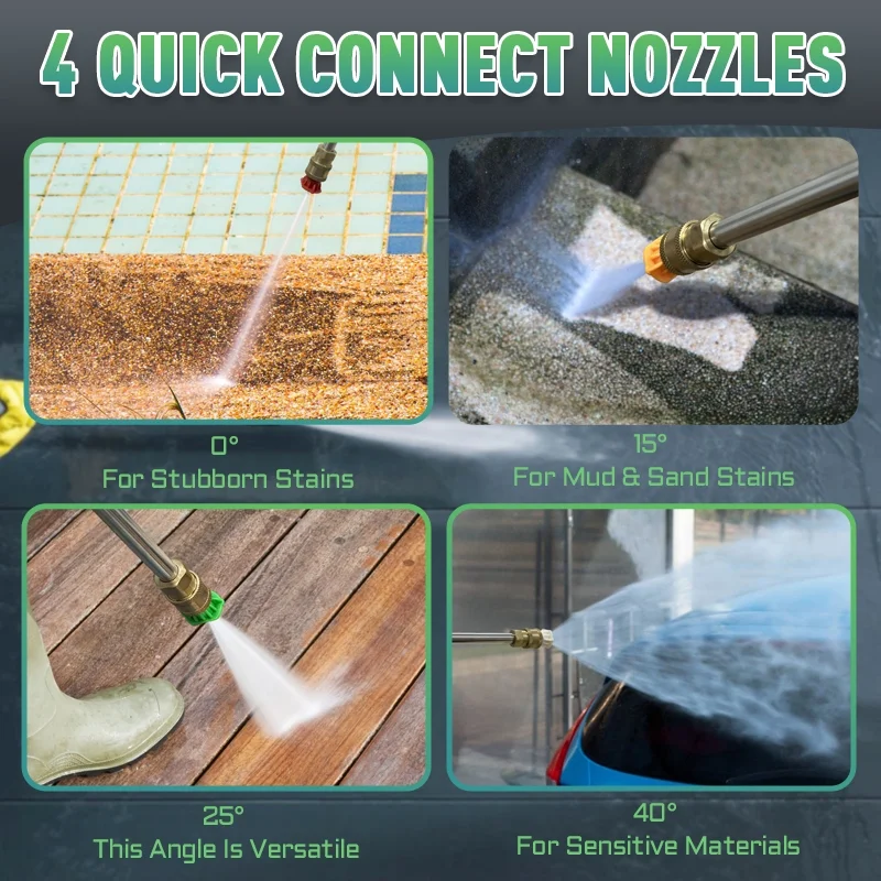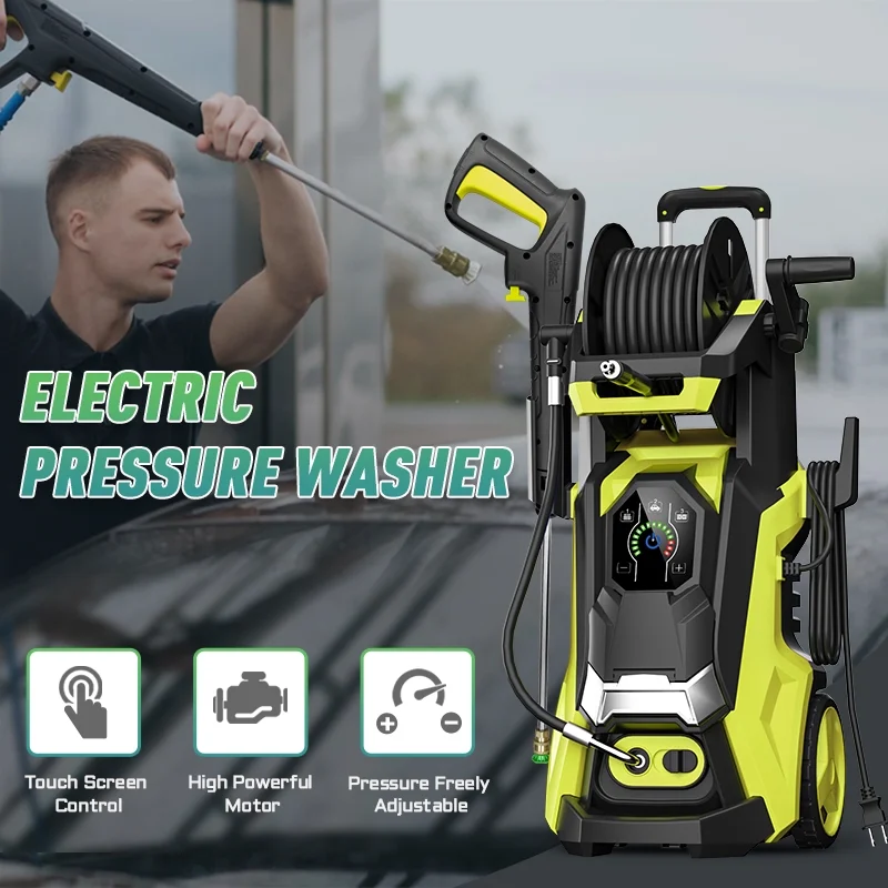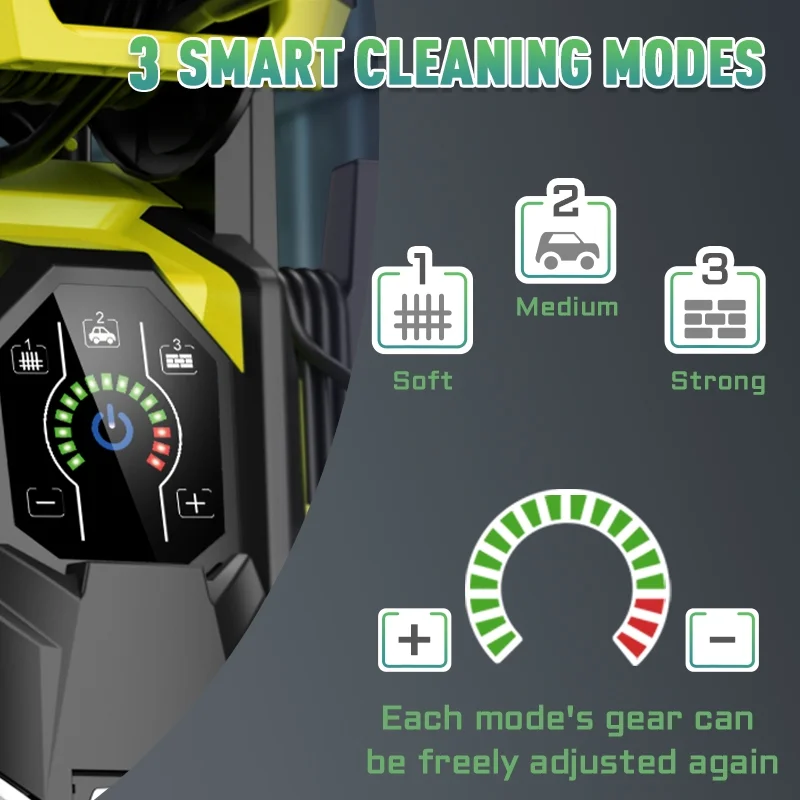 - TOUCHSCREEN PRESSURE CLEANER: Considering into more intelligence, our R&D team has upgraded the washing machine uses a touch screen. It provides three gears(Soft, Medium and Strong), Easily uses +/- buttons to control different levels of pressure, we also provide a soap bottle and 4 different nozzles (0 ��, 15��, 25��, and 40��), you can adjust to the pressure you want according to your needs to complete any cleaning work.