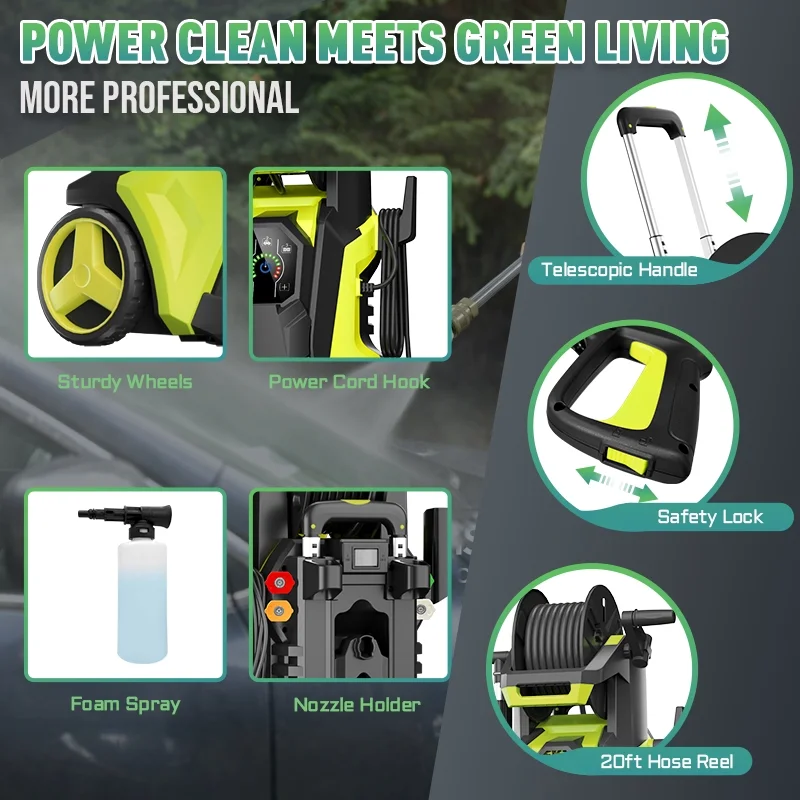 - TELESCOPIC ALUMINUM HANDLE: We have also upgraded the handle to make it be more humane. The new handle adopts a retractable aluminum handle, which can be adjusted according to the height of the user and is suitable for all kinds of people. In addition, two large wheels will also help you carry and transport easily. The 16.3-foot-long cable and 20-foot-long hose can reach anywhere, such as courtyards, streets, balconies, garages, etc.