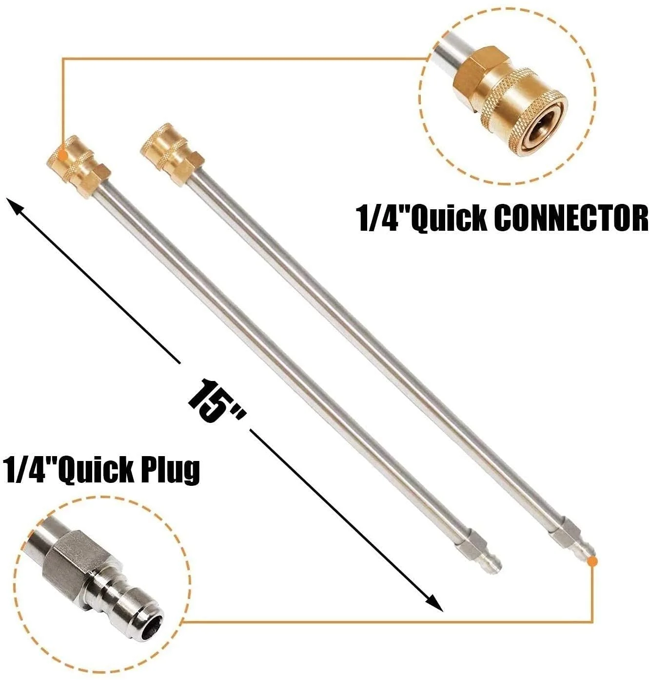 - Good CompatibilityAttaches to 1/4 quickconnect capable wand with ease just like a spray nozzle.2 pcs 17 extension wands are both 1/4 quick connection.Work with power washers up to 4,000 PSI.Required min pressure 2,000 PSI,min flow rate 1.8 GPM.