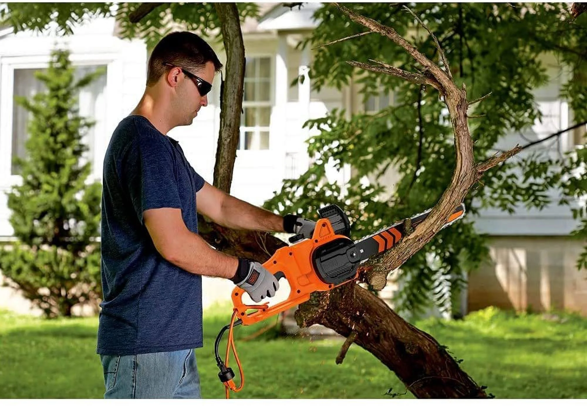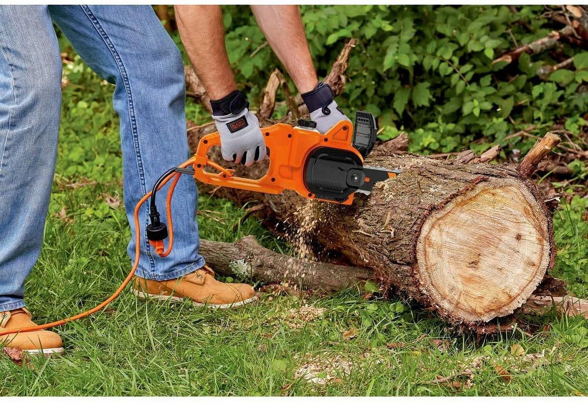 - 14-inch electric chainsaw powers through branches and logs up to 12 inches thick