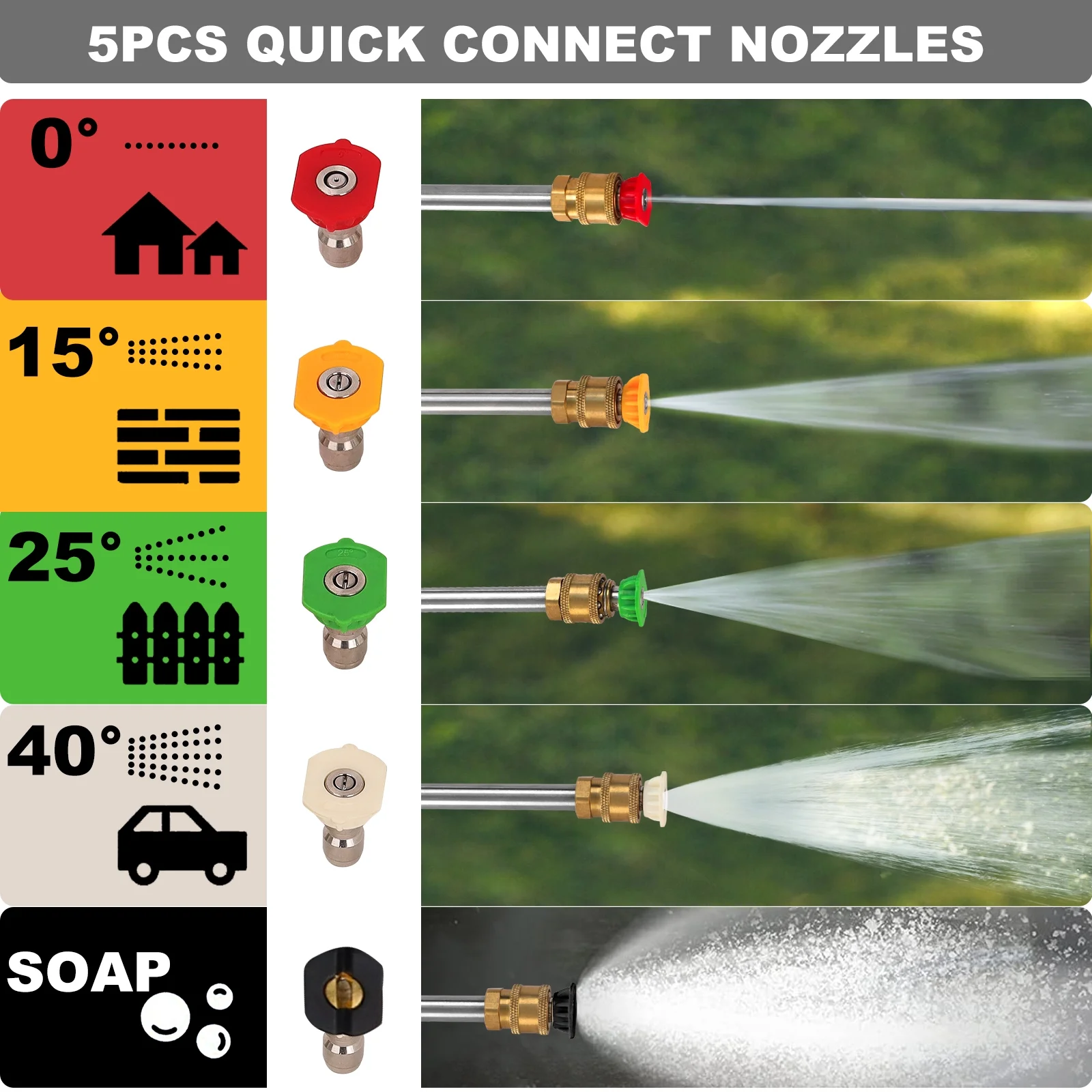 Versatile Cleaning Tools: Comes with a 0.8-gallon soap tank, a 25-foot flexible hose, and five quick-connect nozzles (0��, 15��, 25��, 40��, and soap) to handle different cleaning tasks.The lightweight spray gun makes operation easy.