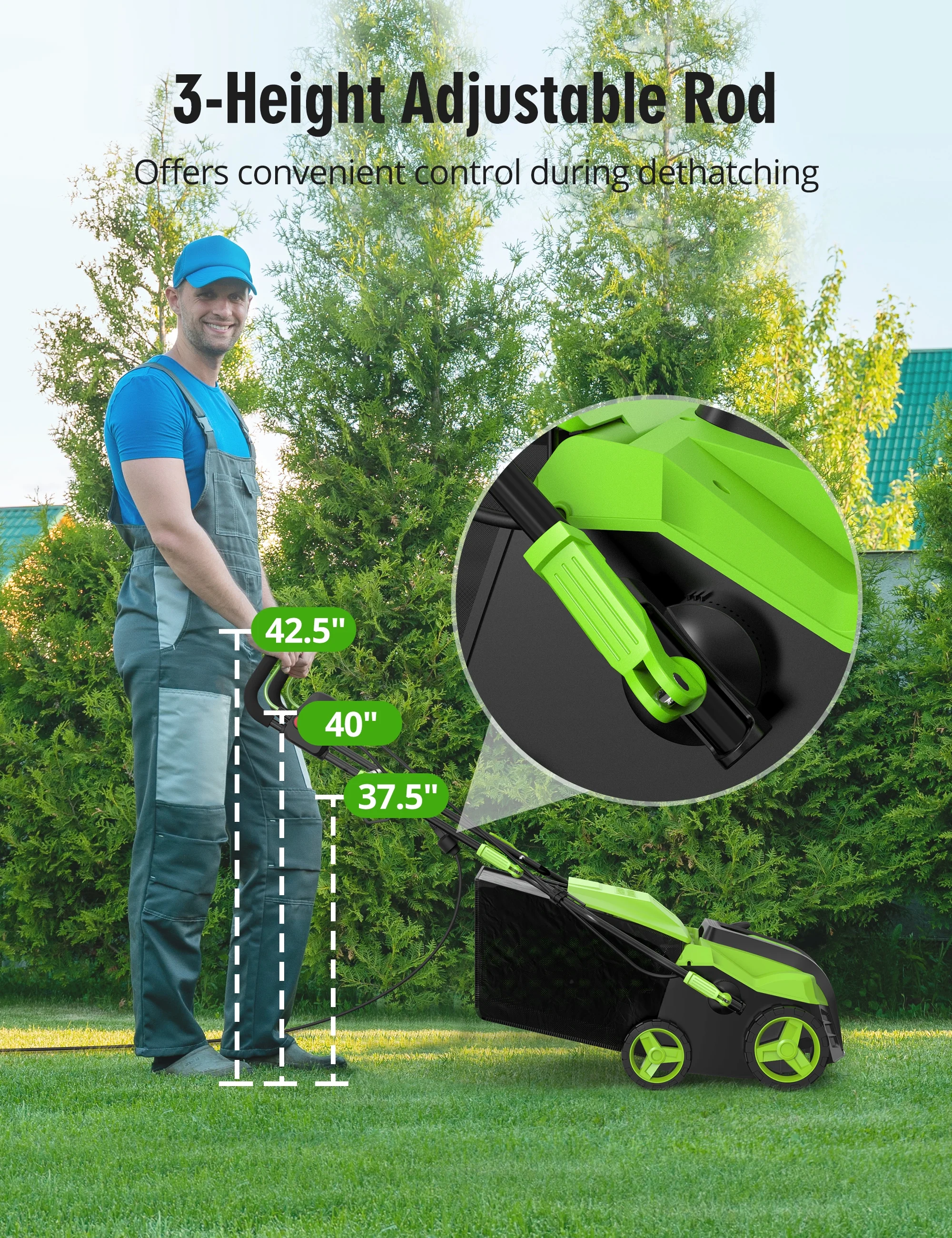 - Working Depth and Angle Adjustment: You can use the 5-position control lever ranging from -0.47�� to 0.4�� to adjust the rake heights for lawn maintenance all year round; the 3-position adjustable rod is suitable for people of different heights, meeting every family��s needs.