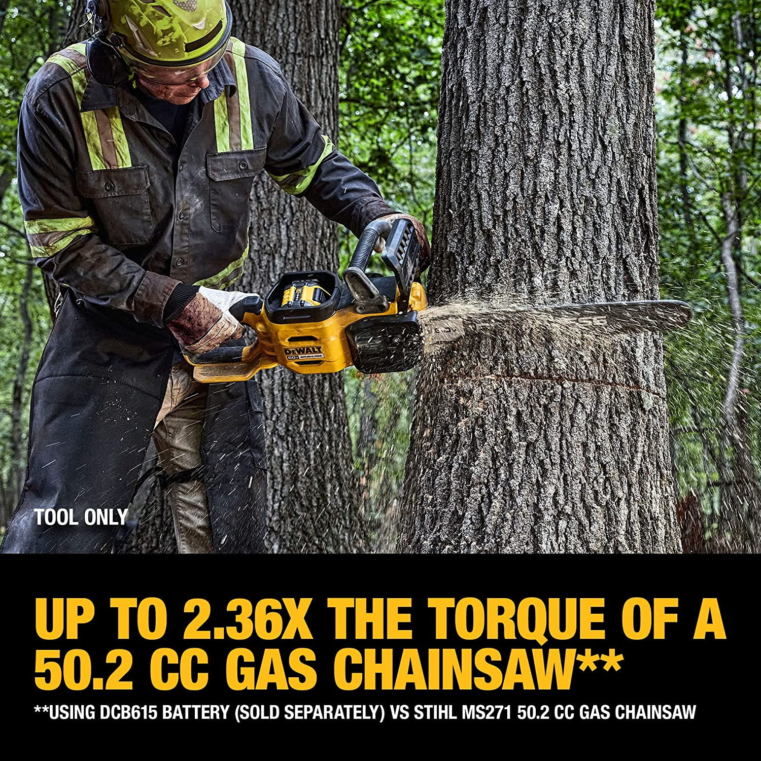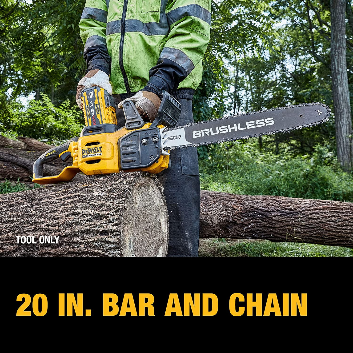 DeWalt 60V MAX* Brushless Cordless 20 in. Chainsaw (Tool Only)Cut, chop, and sculpt with ease using the durable 60V MAX* Brushless Cordless 20 in. Chainsaw. With a peak horsepower of 4 HP using a DCB615 battery (sold separately), this rugged Chainsaw packs the sawing power and dependability needed for routine sunup to sundown workdays. Tighten the chain as needed for steady bar retention while the brushless motor delivers high-efficiency performance with auto-oiling for continuous lubrication. Kick back protection is provided by the chain brake bult-in with the low kick back bar and chain.