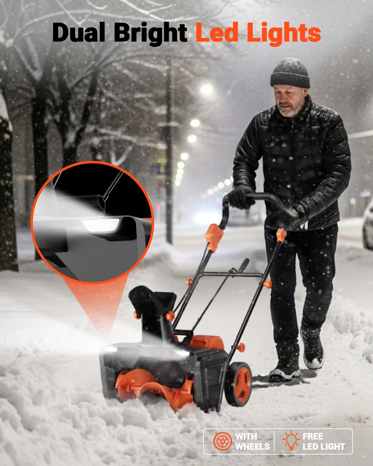 - HIGH MANEUVERABILITY & DIRECTIONAL CHUTE - This snow blower cordless is equipped with smooth wheels and dual LED lights, ensuring that you can easily complete the snow removal tasks both day and night. Moreover, our electric snow blower is equipped with a 180-degree directional chute and features a maximum throwing distance of 25 feet, allowing you to easily select the discharge location and handle various snow removal scenarios.