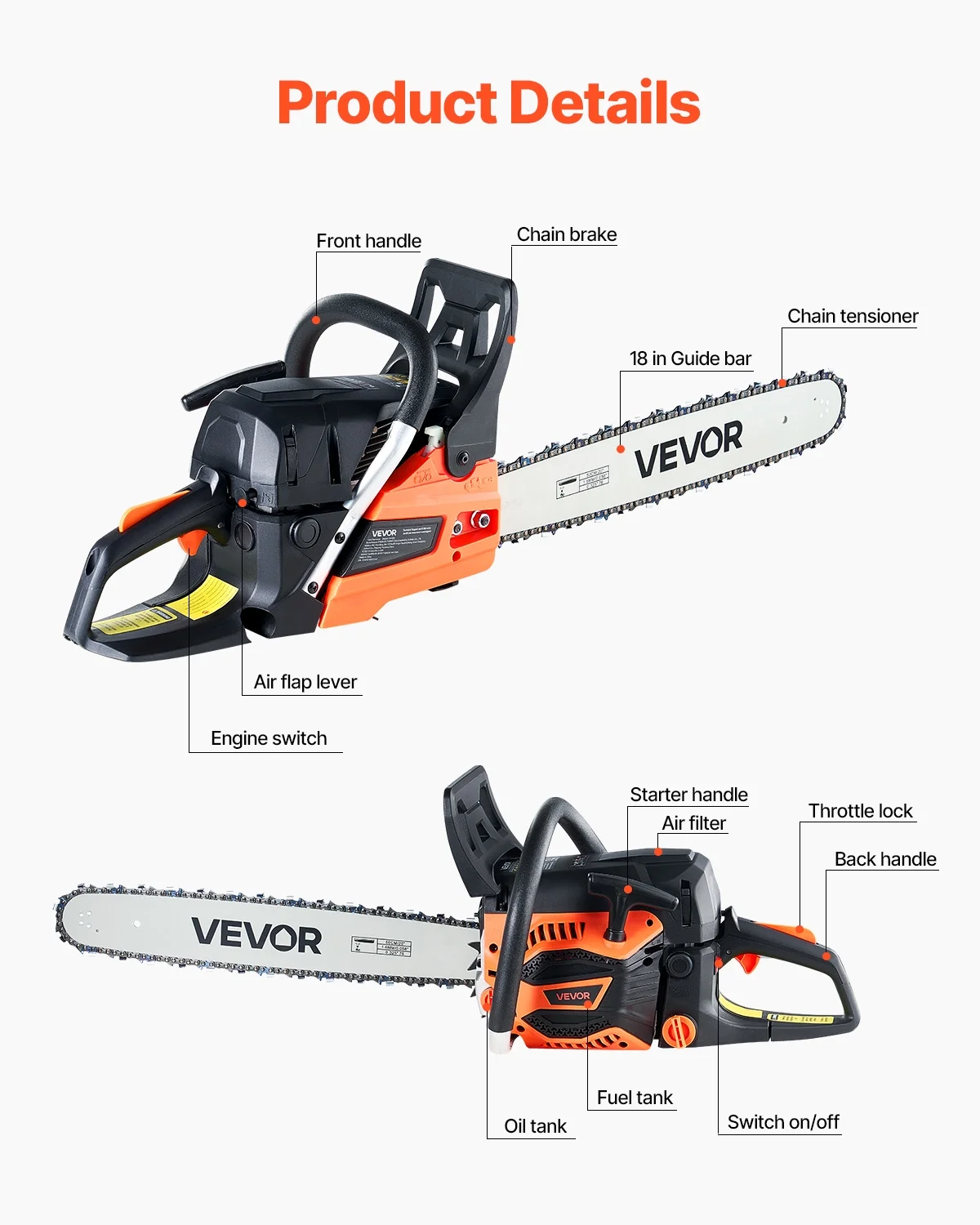 - High-Strength Steel: Cut trees quickly with our gas chainsaw, thanks to its high-strength steel chain and bar. The 18" bar reduces sawdust splatter, keeping your work area cleaner and safer. This chainsaw is designed to boost your efficiency and comfort on the job.