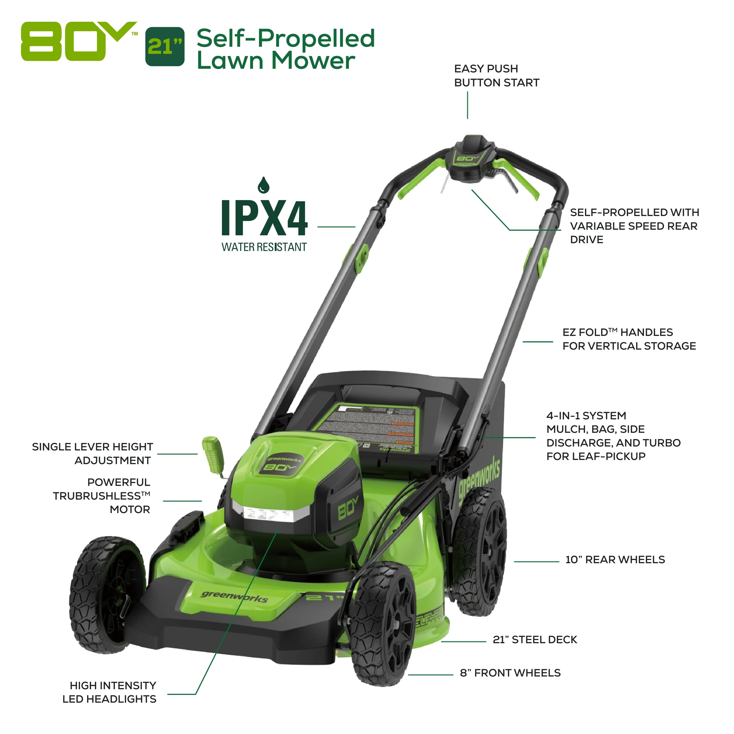 - Greenworks 80V 21" Brushless Cordless Self-Propelled Lawn Mower