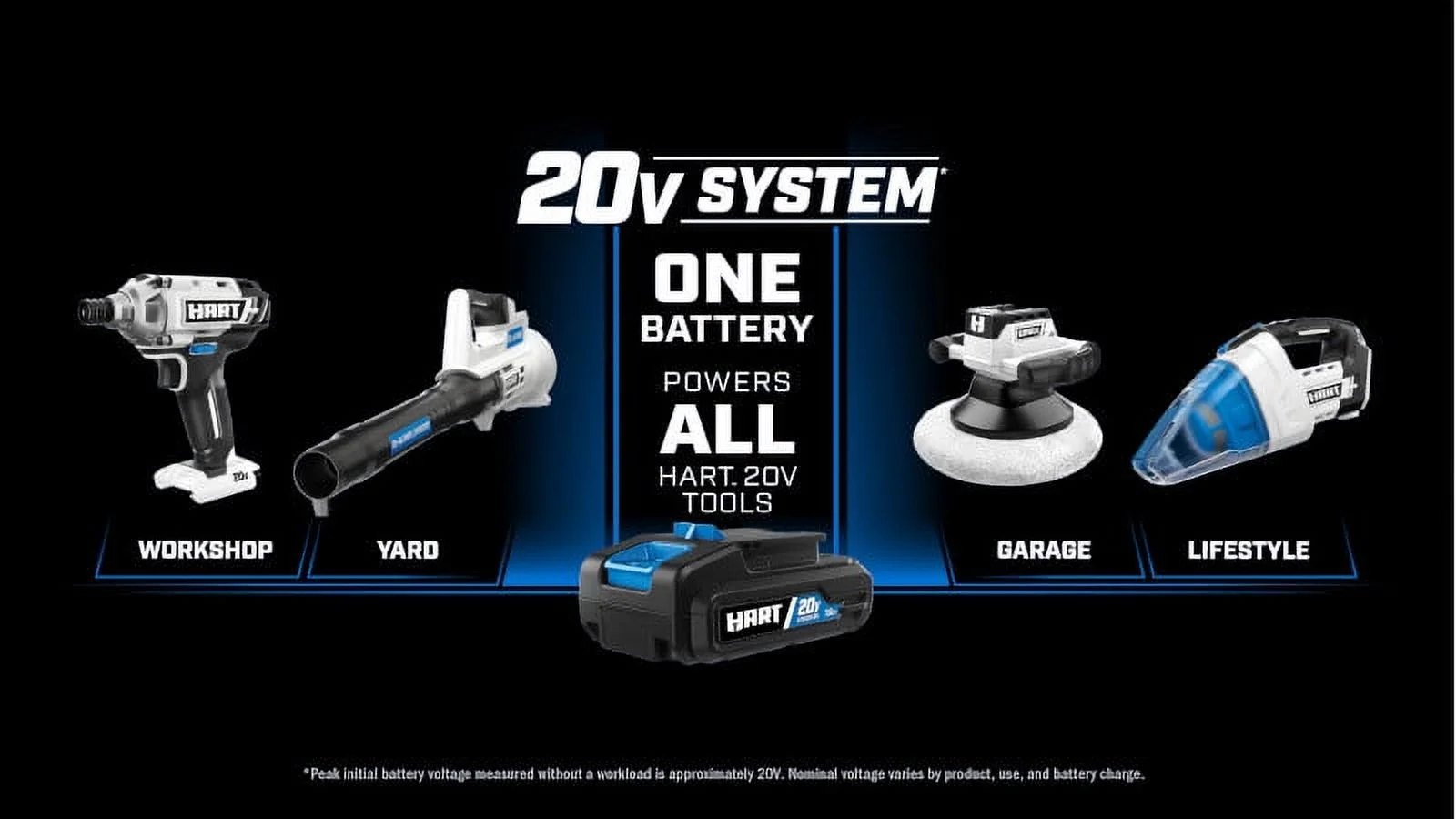- The 20V one battery system allows you to interchange the battery on all 20V HART products. It powers all HART 20V tools, outdoor, automotive and lifestyle items
