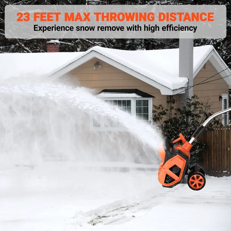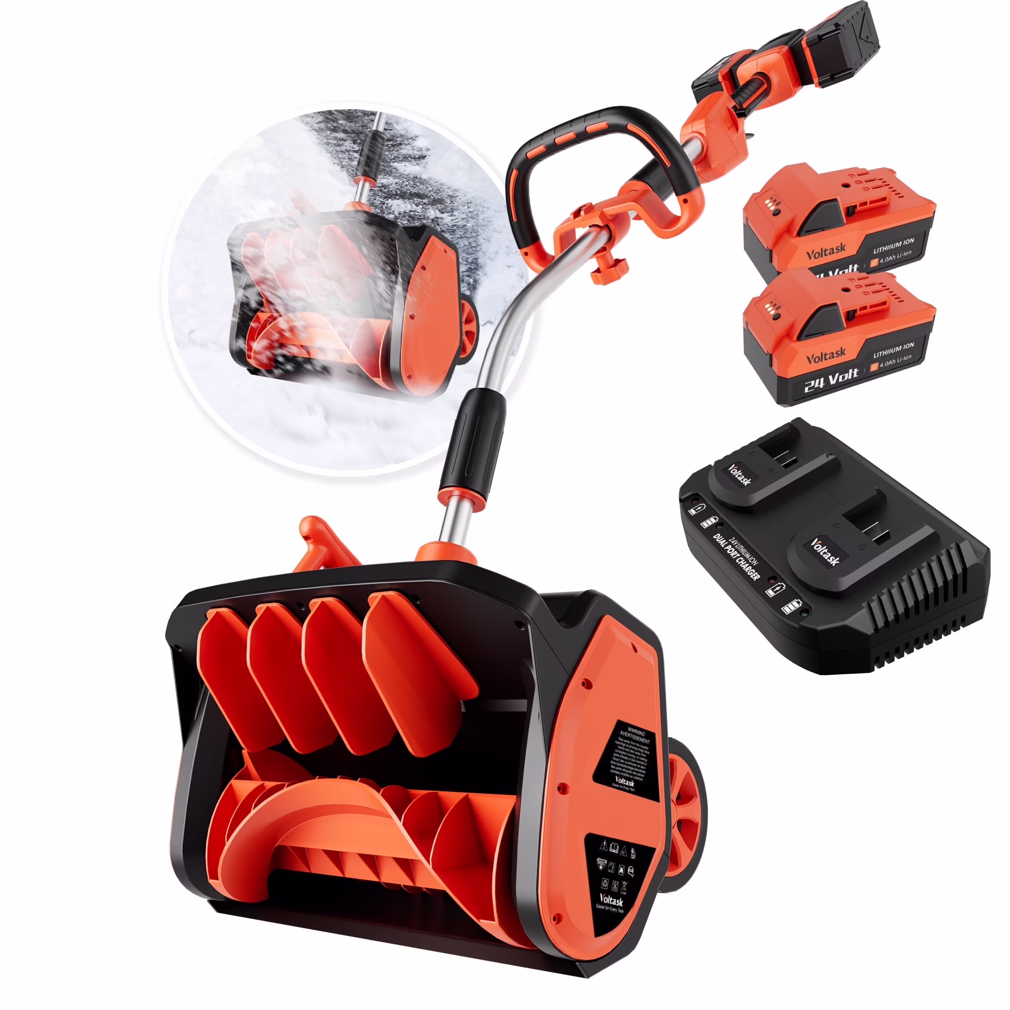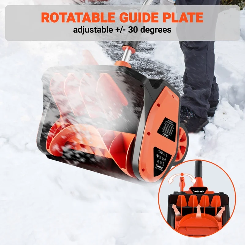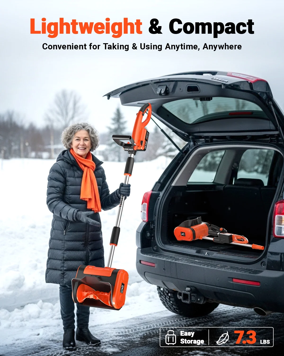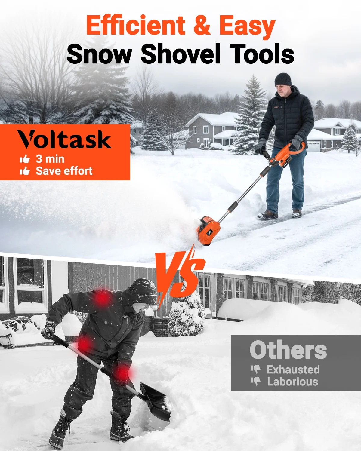 - LIGHTWEIGHT & HASSLE-FREE - The battery-powered snow shovel weighs only 9.24 lbs for ease of use and operator comfort, easy to operate by a simple push-button start. With Voltask cordless snow blower, there is no need to worry about complex maintenance tasks, fossil fuel requirements, carbon emissions or tangled extension cords.