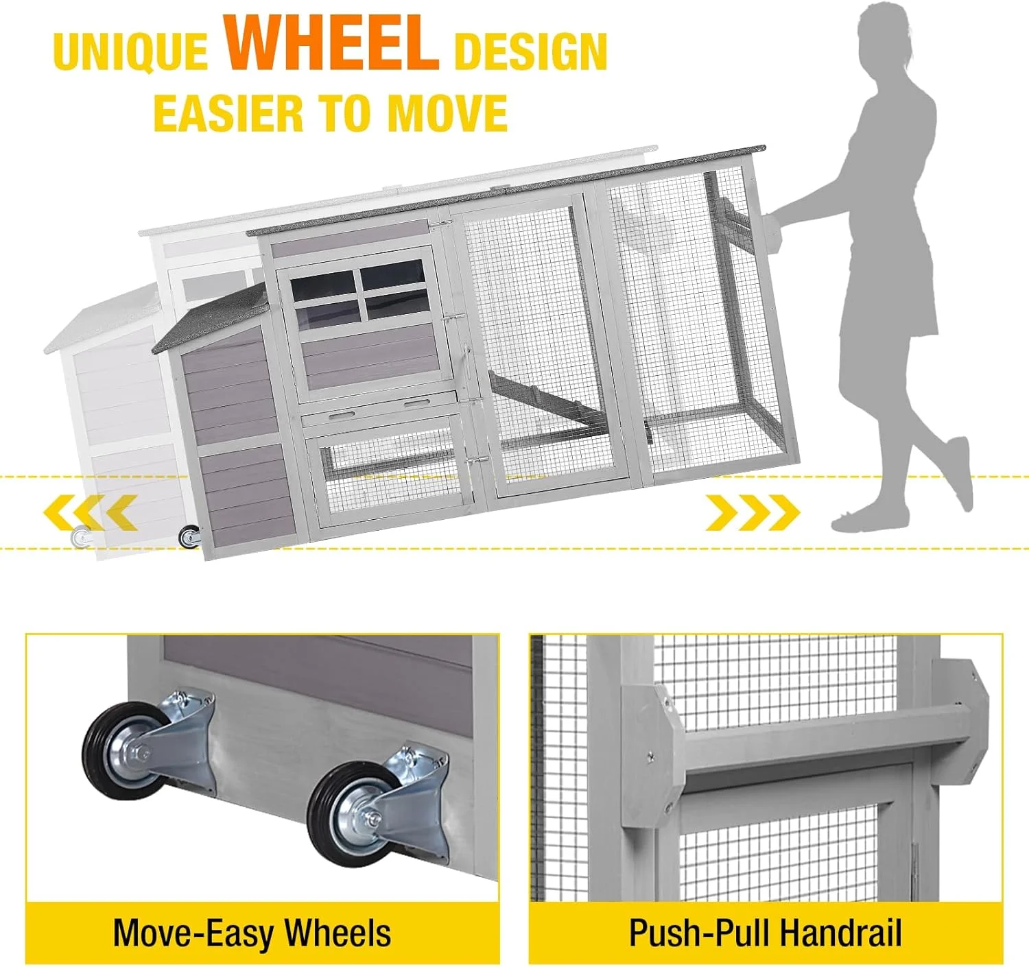 - TWO durable wheels with long design handle makes this chicken coop move easily.