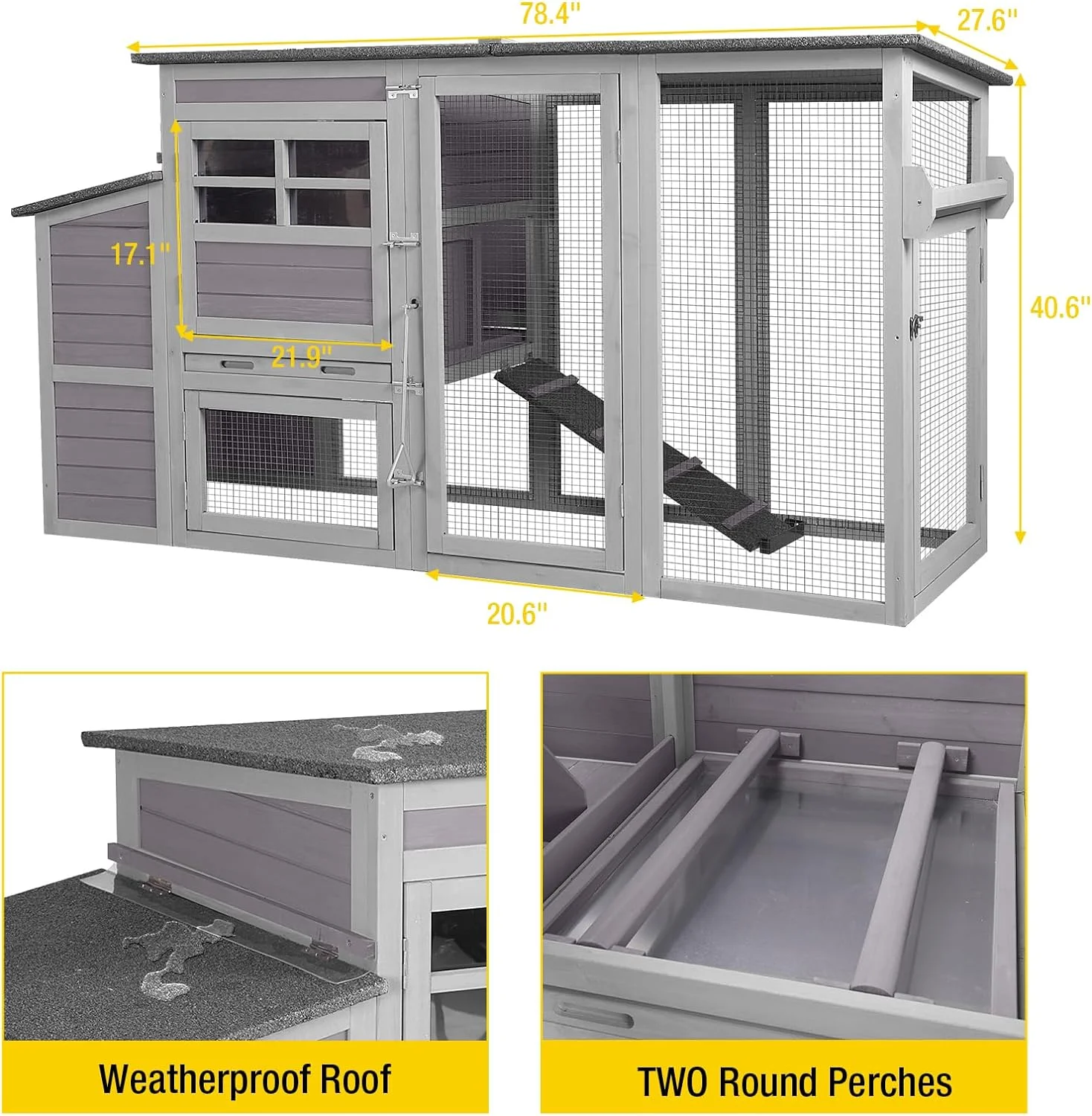 - This chicken house has large run area for hens to move freely. Poultry cage overall size: 78.4"(L) x 27.6"(W) x 40.6"(H), this coop is enough for 2-4 chickens