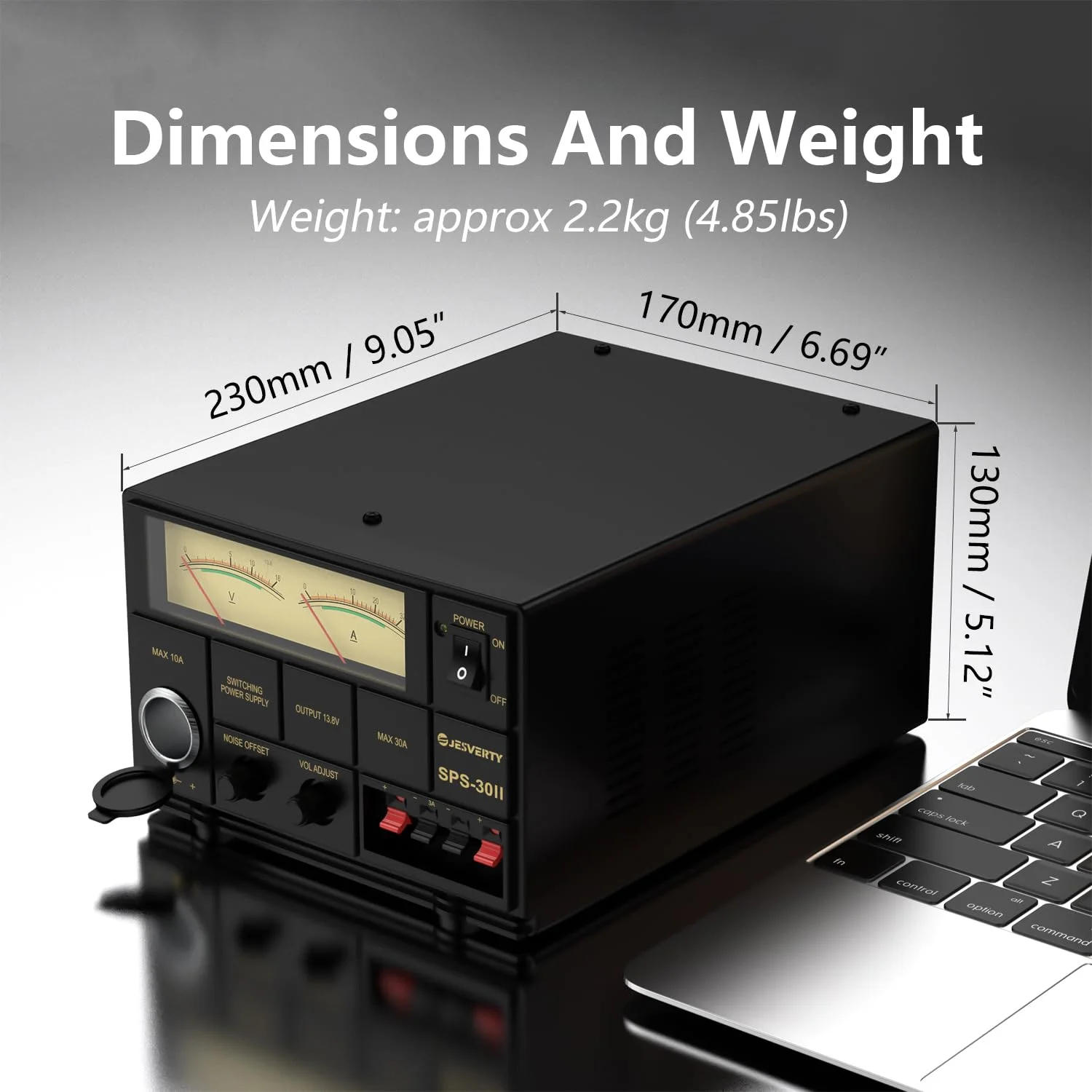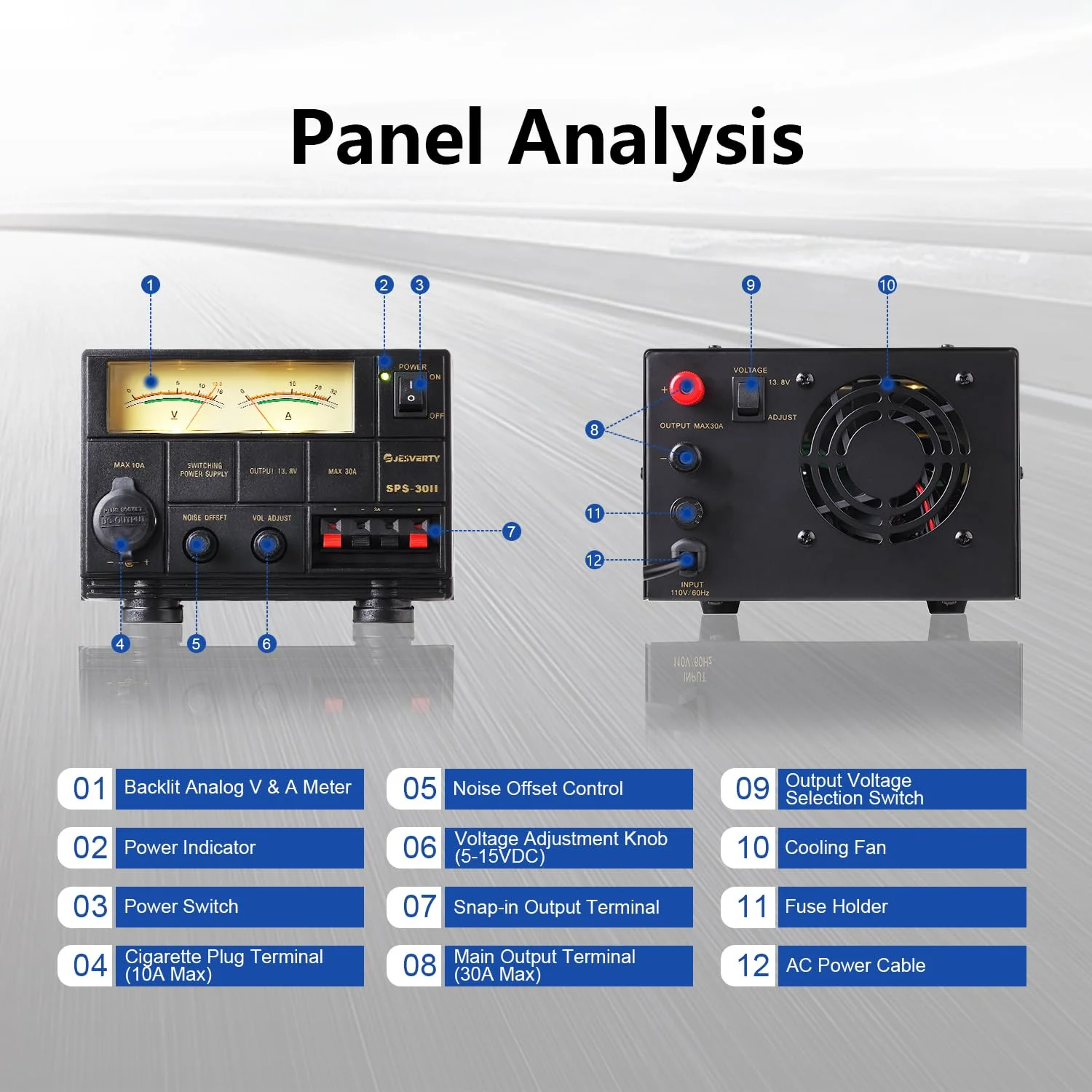 - ��Variable Output & Noise Offset�� The SPS-1332 can switch between 9-15V continuous variable output voltage and 13.8V fixed output, intermittent maximum output current up to 30A. The noise offset function moves annoying switching noise to another frequency.��LCD Display�� The LCD display with backlight is very clean and easy to read, and you can monitor the output voltage and output current in real time.��Fan & Protection�� Built-in cooling fan, forced air cooling prevents internal overheating; Short circuit protection, automatic current limit, and overvoltage protection are standard equipment to protect the safety of both the user and the connected device. I will give it to you.��Compact and lightweight�� SPS-1332 is 155 (W) x 70 (H) x 205 (D) mm; 1.5 kg, compact and lightweight.��Output terminal�� Front panel: Banana plug safety socket (5A MAX) x 1 pair, Rear panel: Land type terminal (30A MAX) x 1 pair