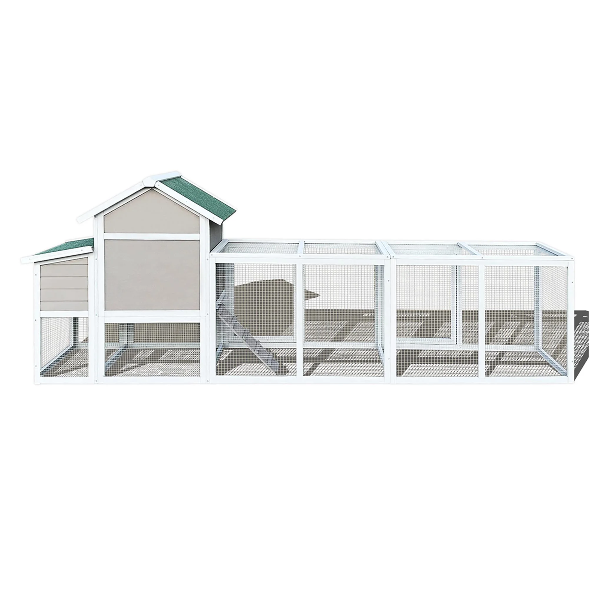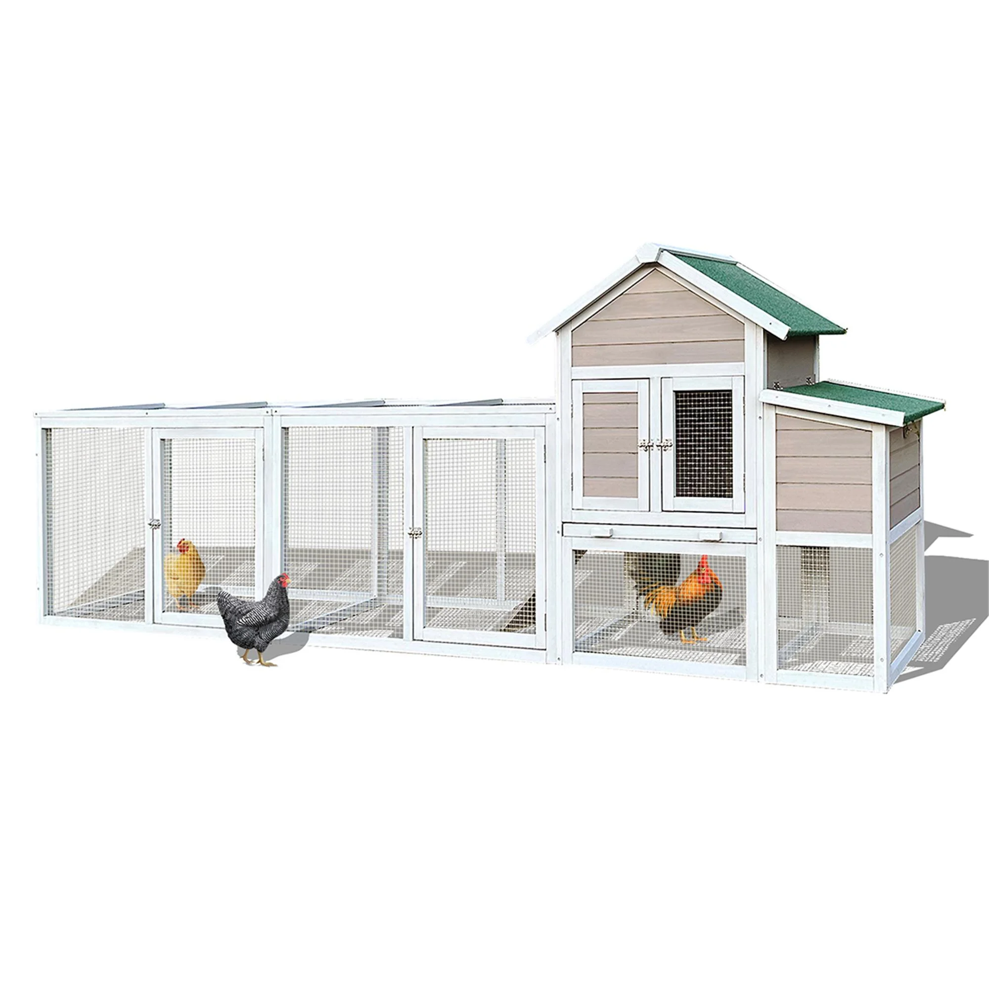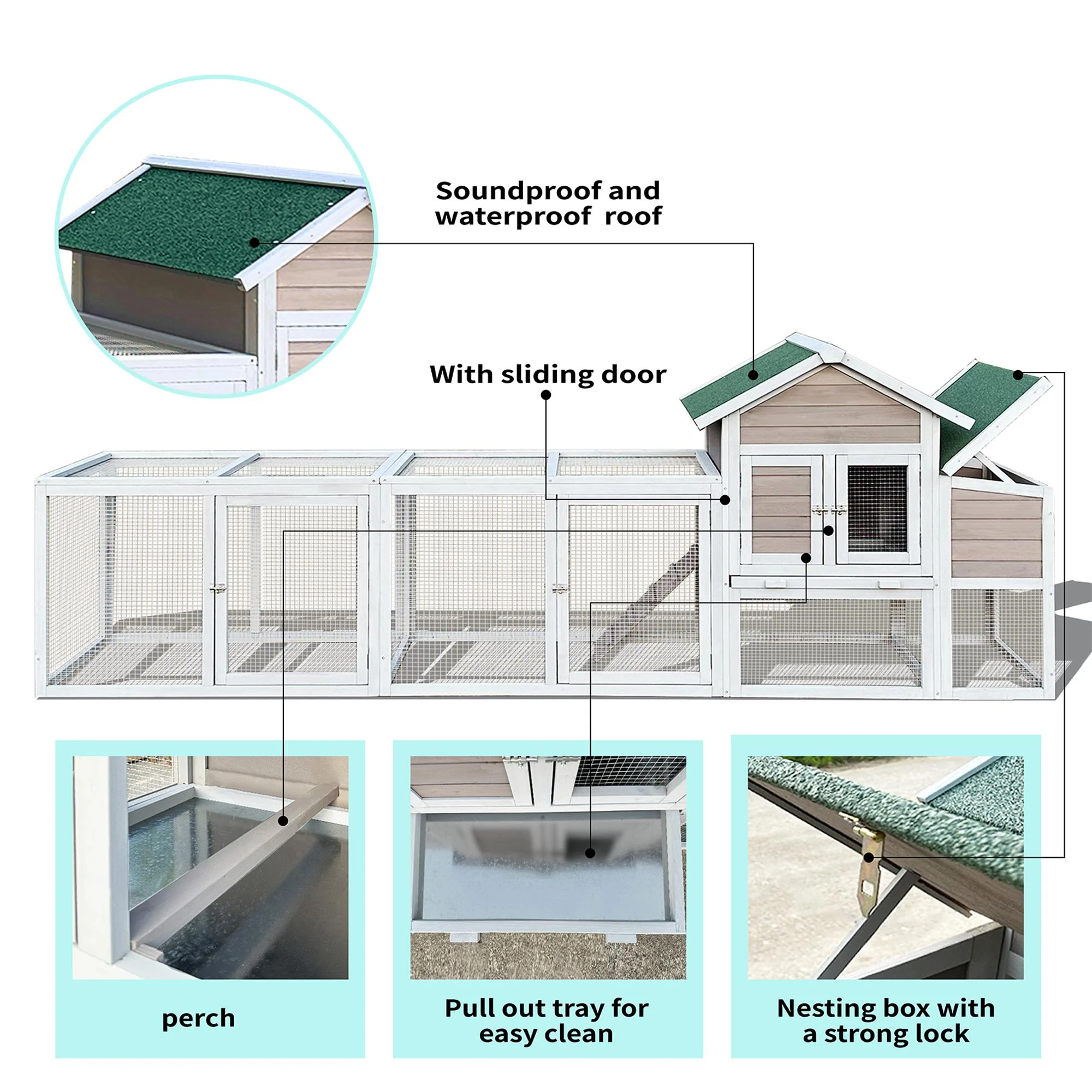 Pefilos Chicken run with roof design keeps your poultry safe, dry and warm, especially in the rainy cold days. It's also handy in the heat as they are shielded from the sun and can easily access their chicken coop or nesting boxes without exposure to the harsh light. Hen house with the pitched roof your poultry can run outside even in rainy days. The pet cage fences are vital to the ventilation of poultry , they will also protect your poultry from the outside predators. Chicken house can hold between 4-6 chickens, depending on size and breed. Rabbit hutch made of natural Fir wood and painted with eco-friendly waterproof non-toxic varnish and galvanized wire mesh for a sturdy construction that will last in all weather conditions. The original wood is firm and natural for your beloved pet. Thanks to the eco-friendly paint, the cage is waterproof, anti-corrosion and also UV-resistant, which offers long-lasting lifespan to provide a warm house for pet all the time. There bunny house is removable bottom sliding tray for easy cleaning. High quality gridding fences provide a healthy poultry lifestyle. The extra large volume allows your pet a lot of room to move. 79 inches chicken coop comes with nesting box, resting box and chicken perch.