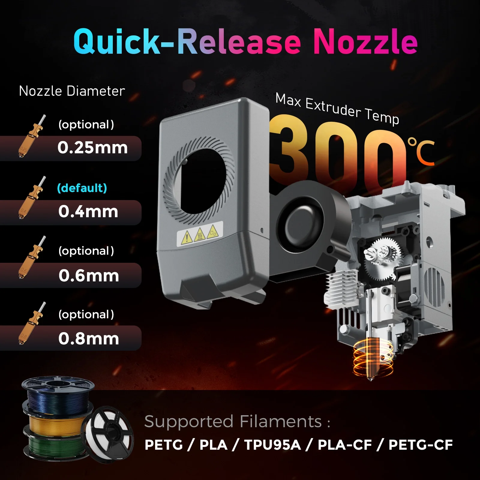 - Offers quick-release nozzles in multiple diameters (0.25/0.4/0.6/0.8 mm) to cater to various materials and inspire your creativity.