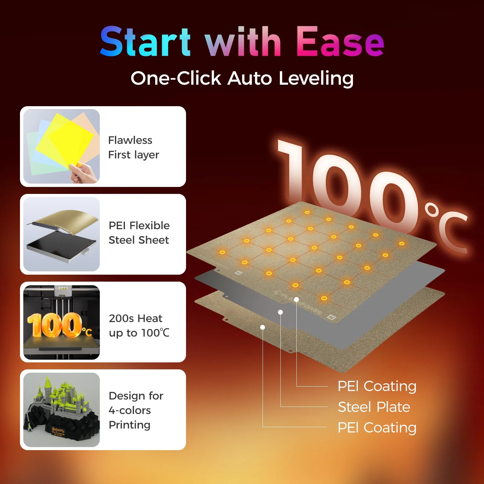 - Features a full-auto one-click leveling system that measures the distance and automatically calculates the correct offsets, ensuring a perfect first layer without any manual calibration.