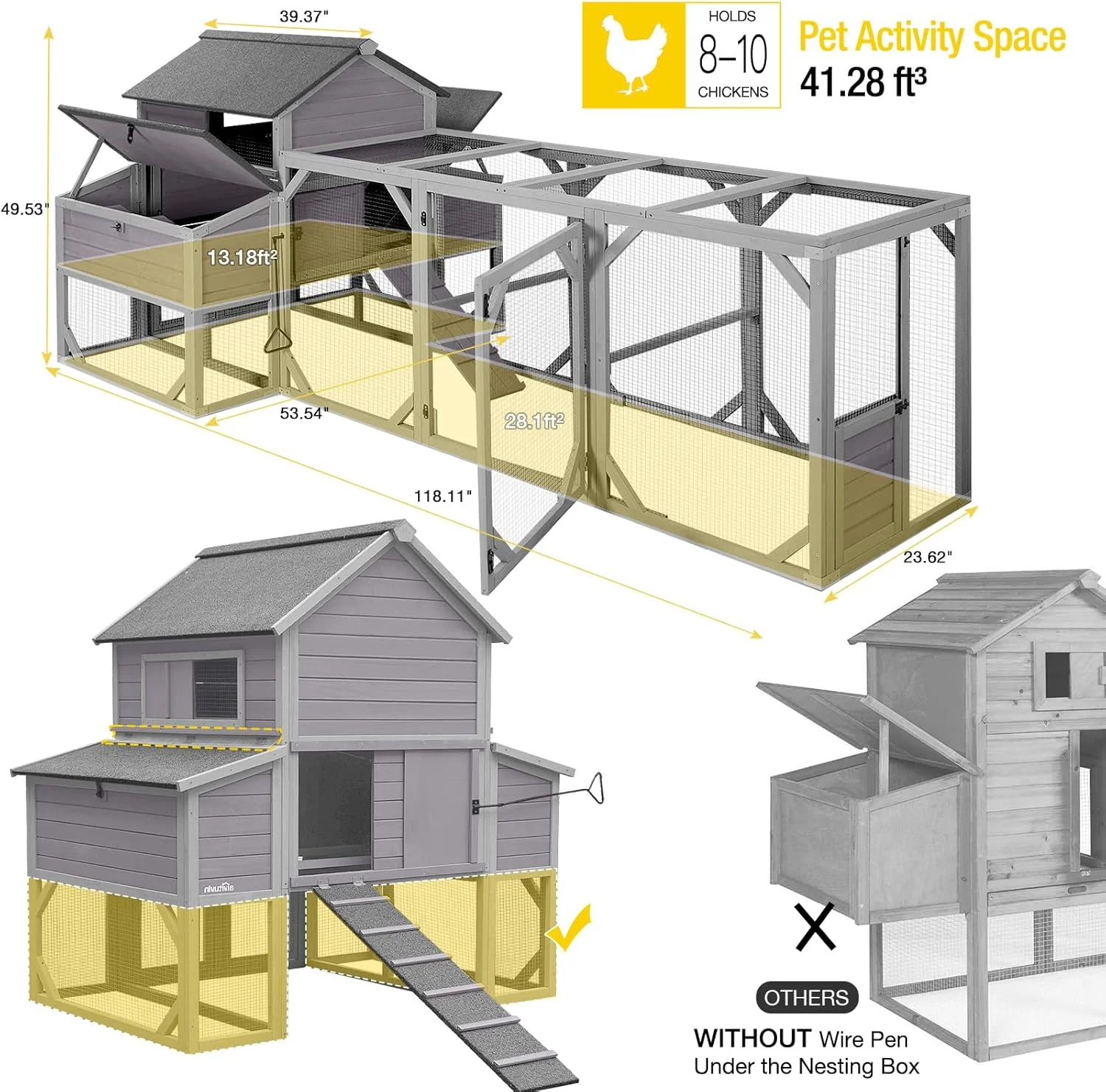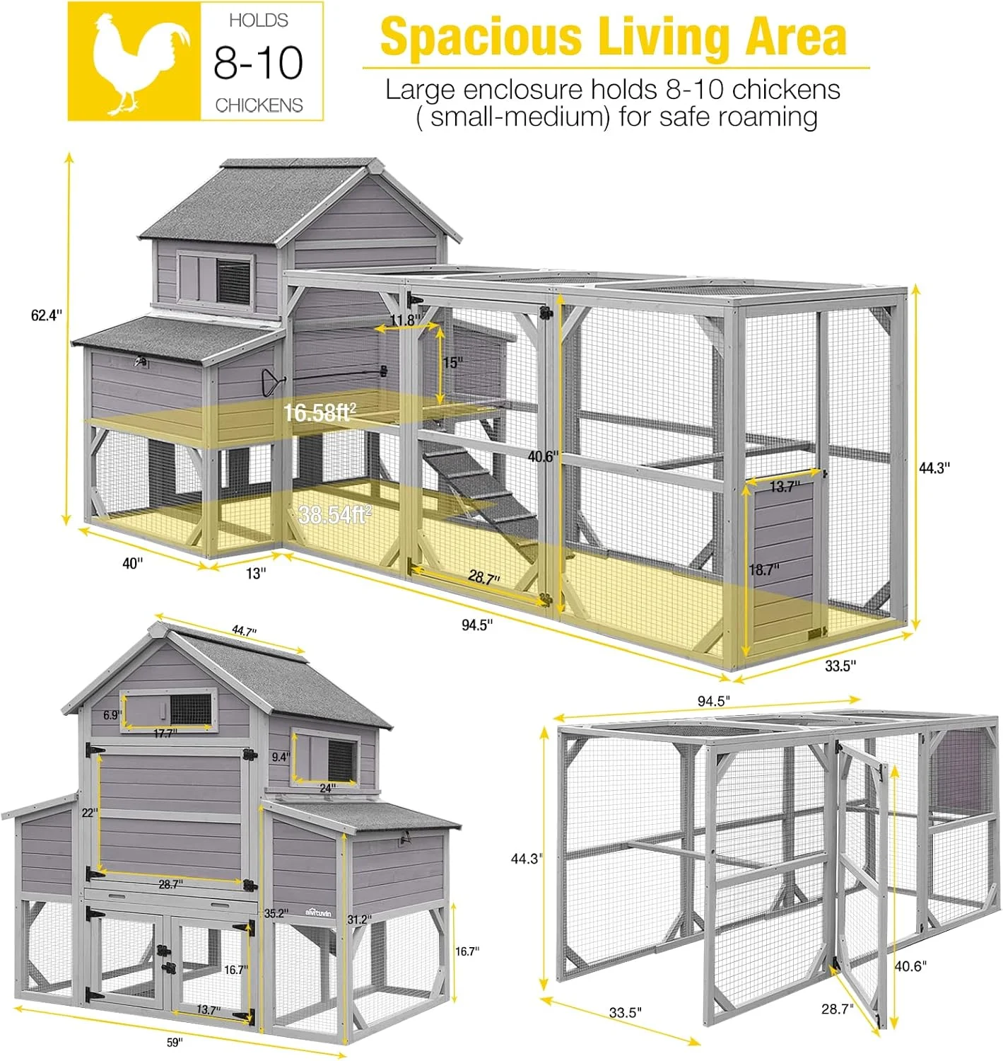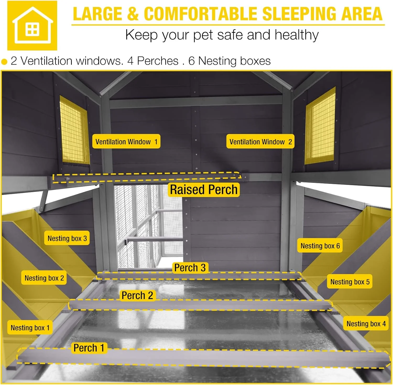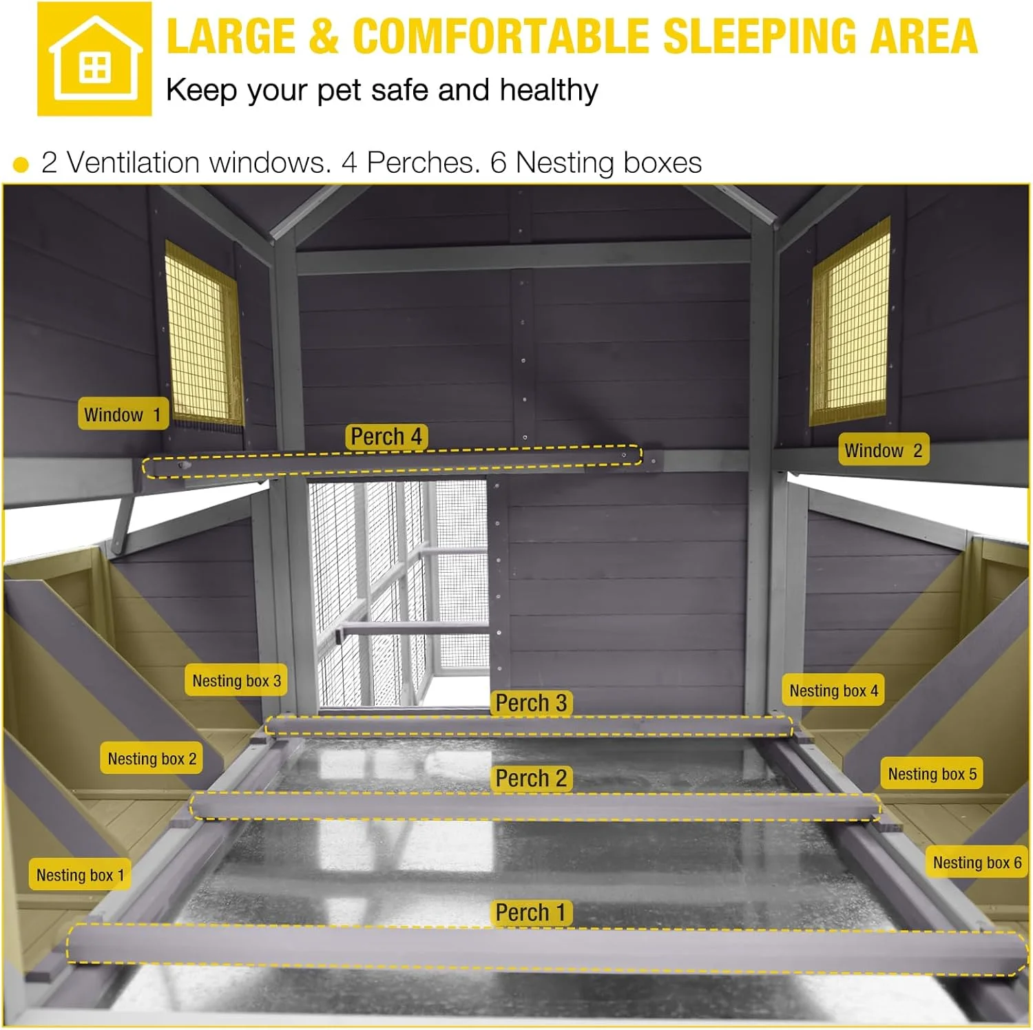 - Nesting Box And Perch: Poultry house with two large nesting boxes, each box divides into THREE parts. FOUR perches inside the house, TWO perches built in the run, provides a lot of sleeping area for your hens