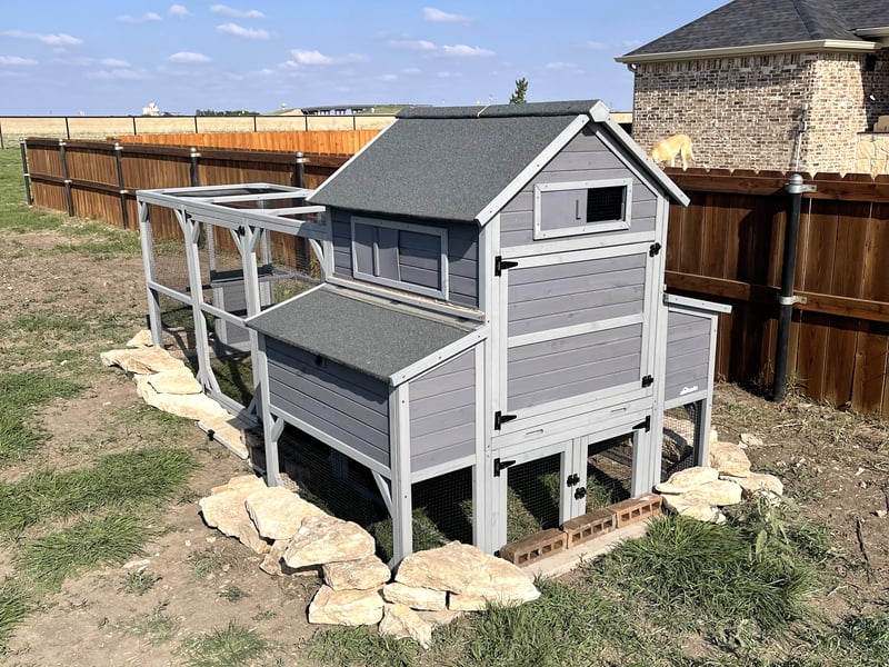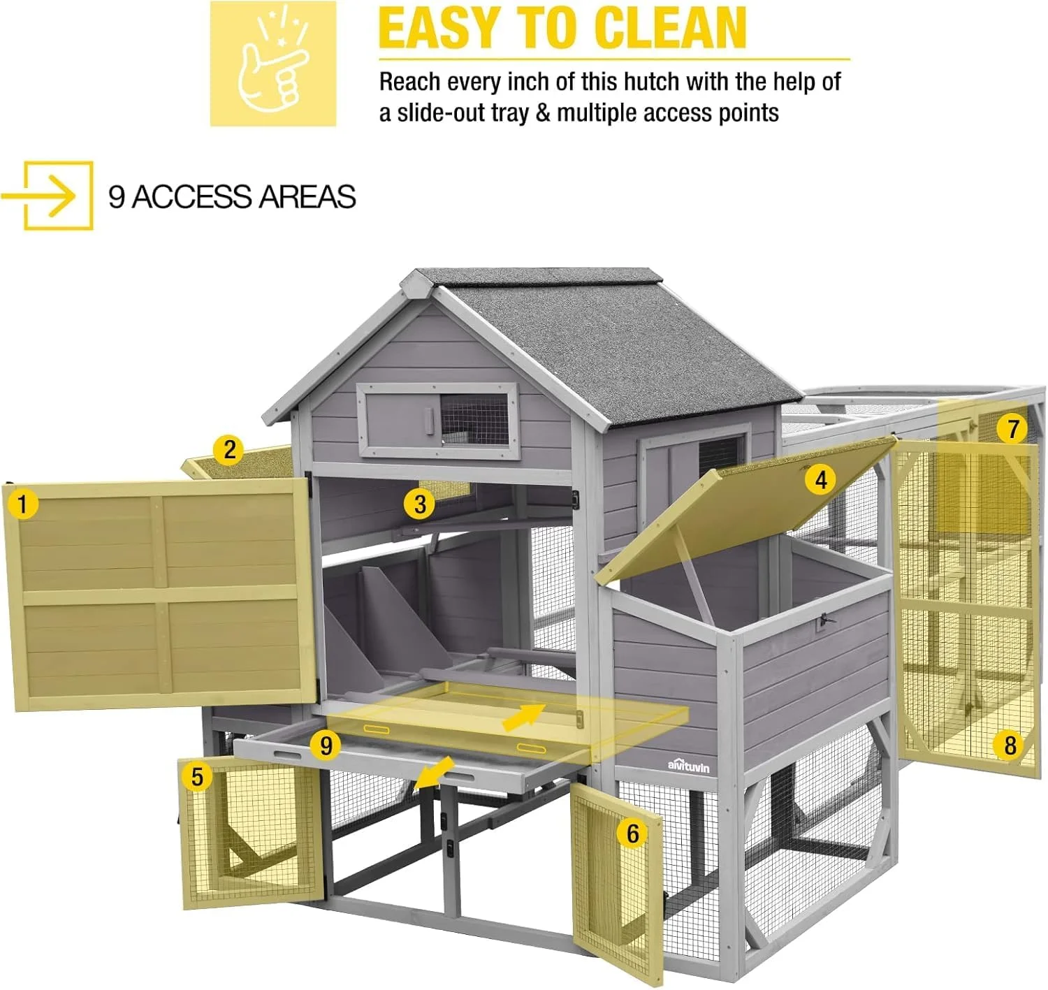 - Easy To Clean: Comes with large removable sliding trays for easy cleaning. Easily reach all areas of the hen coop with SIX access areas. Three screened ventilation windows at the sleeping shelter for good ventilation