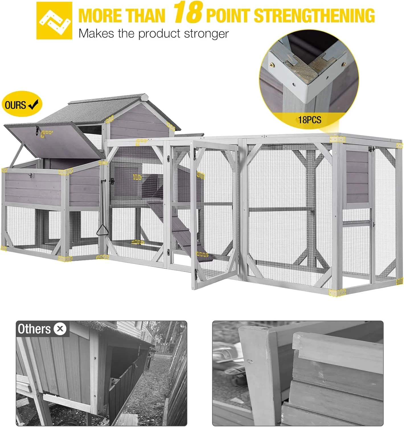 - Strong Contruction: Run panel extends under two nesting boxes to support and avoid the chicken house sag after a long time of use. All boards are reinforced with wooden corner strips to make the hen house stonger