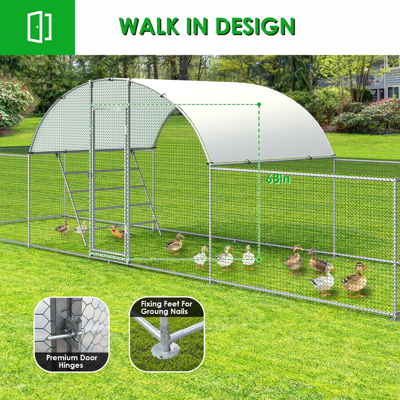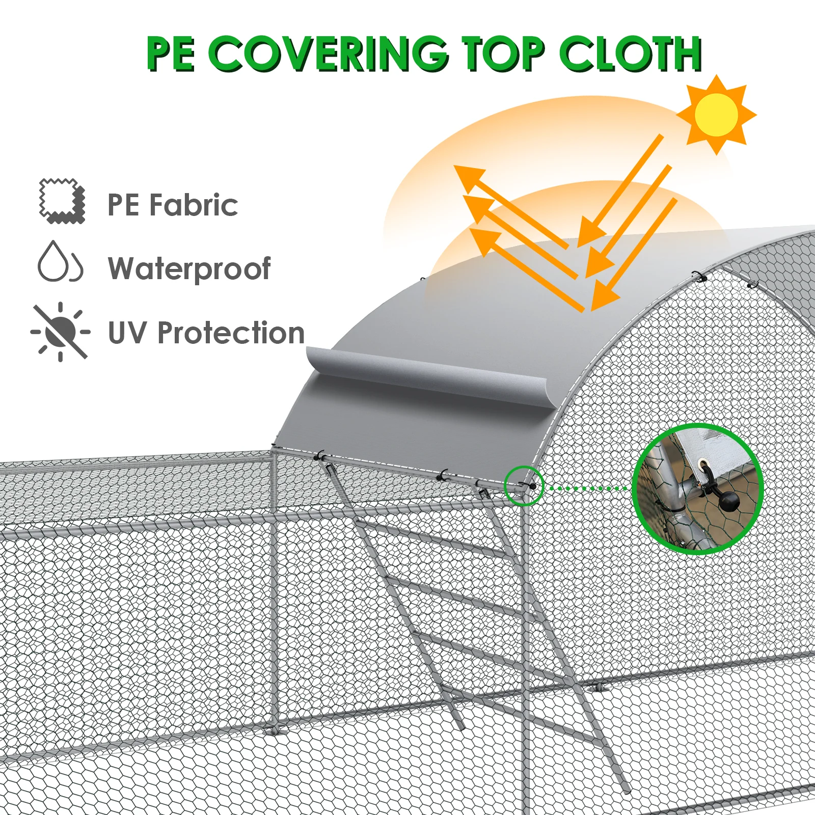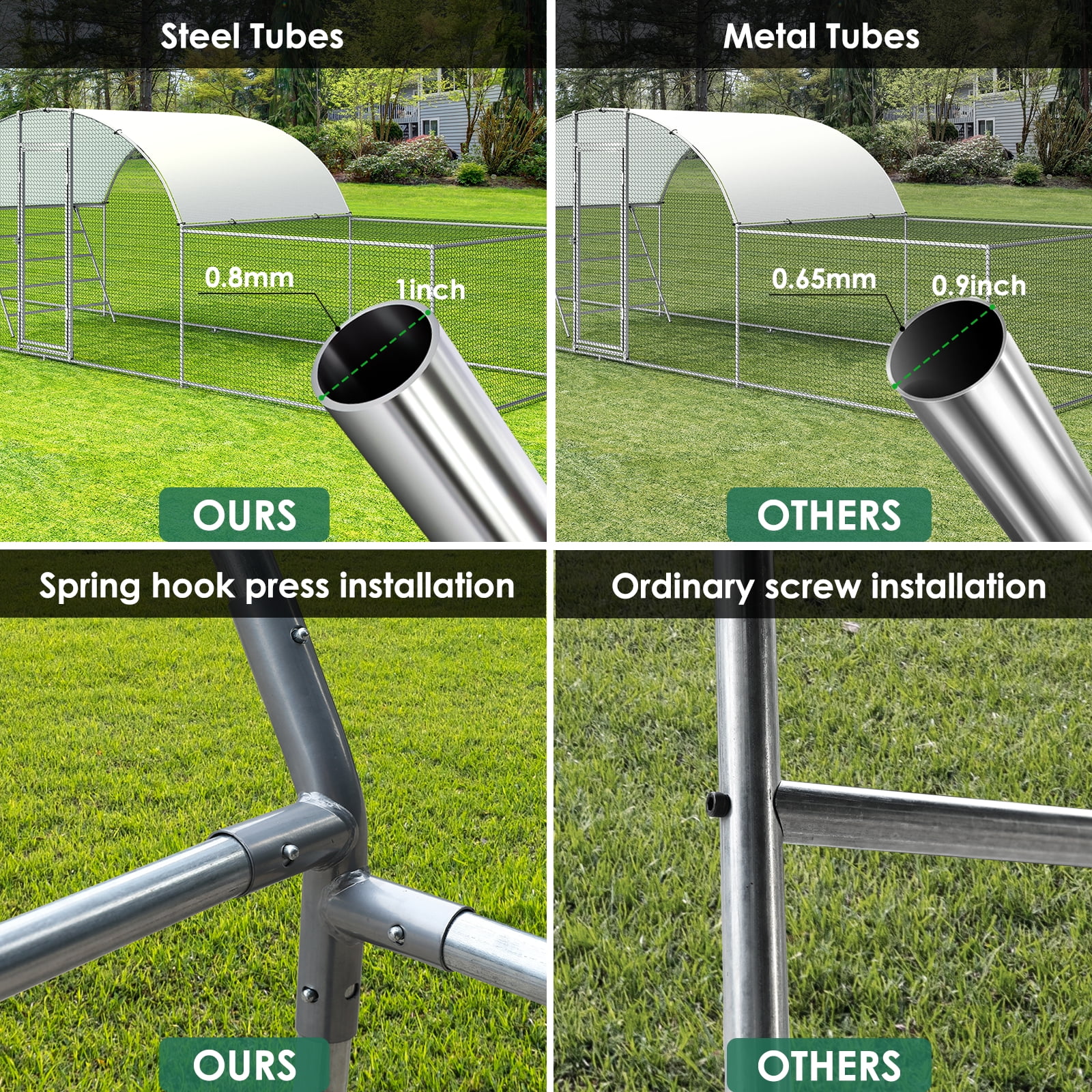 Arlopu Metal Chicken Coop, sized at 276 x 79 x 79 in, offers robust protection and versatility. Its heavy-duty galvanized steel frame, made with 1mm-thick pipes, withstands tough weather, while the full-coverage PVC-coated wire mesh keeps predators out. The lockable steel door, secured by a latch and wire rope, adds extra safety for chickens, ducks, geese, dogs, and other small animals.