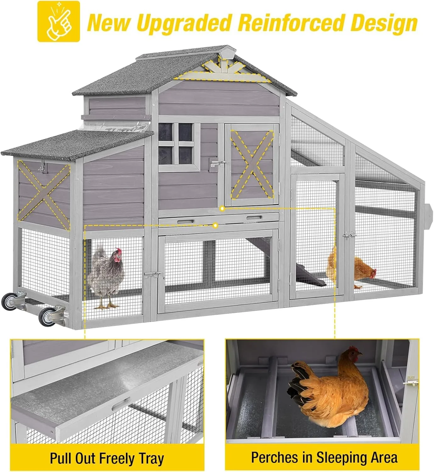 - two round edge perches above the tray for chickens to roost