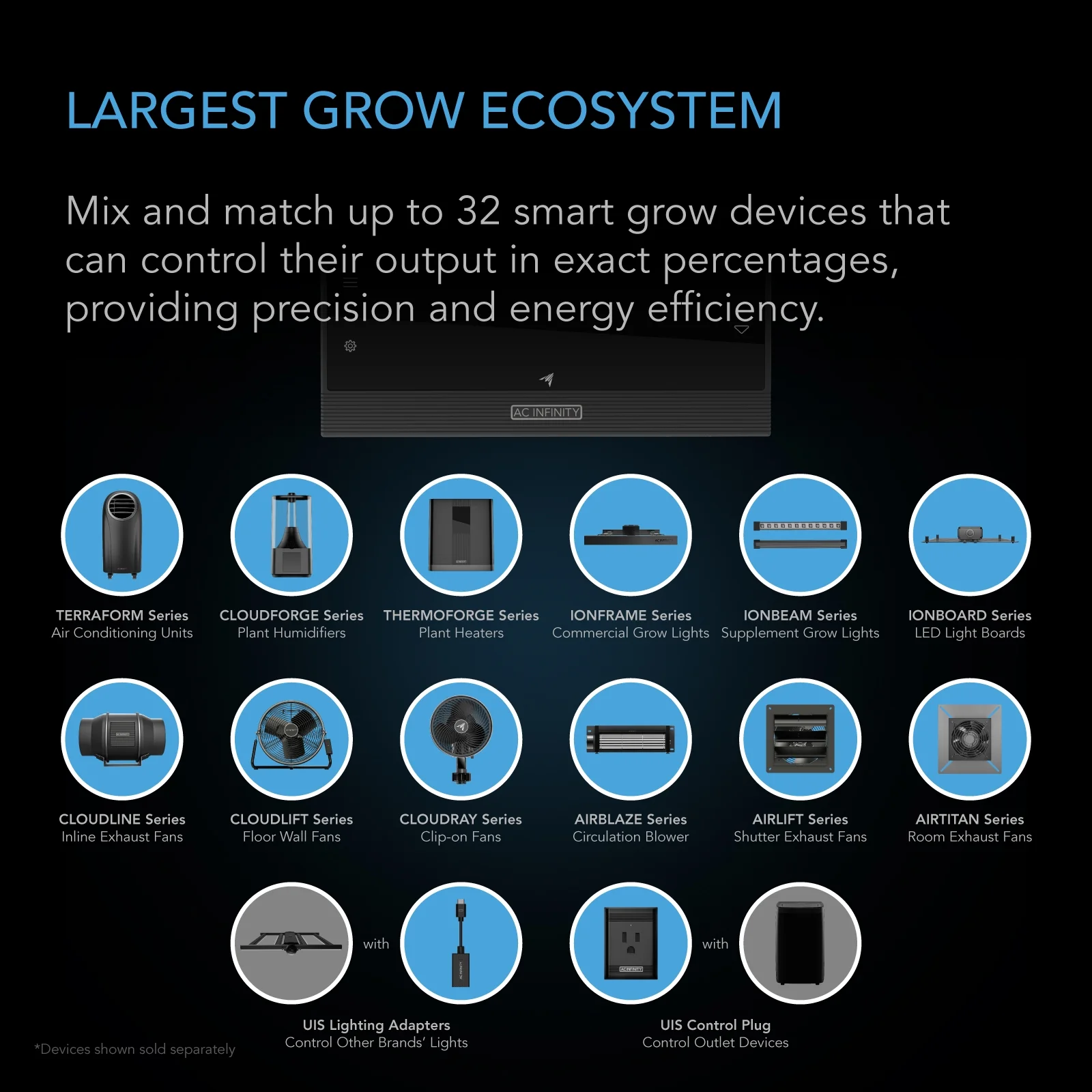 The CONTROLLER AI+ is the first to harness artificial intelligence for universal device control and complete oversight of your grow. This bundle includes our innovative CO2 sensor, which features adaptive self-learning to automate the critical task of monitoring and maintaining optimal CO2 levels, ensuring healthy and thriving plant growth. Using AI-derived insight, this self-automating controller can provide unparalleled accuracy and stability while avoiding extreme environmental spikes. Connect to up to 32 UIS? devices (when using splitter hubs) like fans, grow lights, humidifiers, and heaters to optimize your grow space��s temperature, humidity, and VPD levels. It also features smart outdoor monitoring that tracks the climate inside and outside your tent for even greater oversight. A reliable ecosystem, this intelligent platform can retain programming even if it's disconnected from Wi-Fi so your grow remains safe and thriving. This product is a part of the UIS? platform of grow devices and smart controllers, designed to unite with the AC Infinity app over Wi-Fi to achieve your ideal environment.