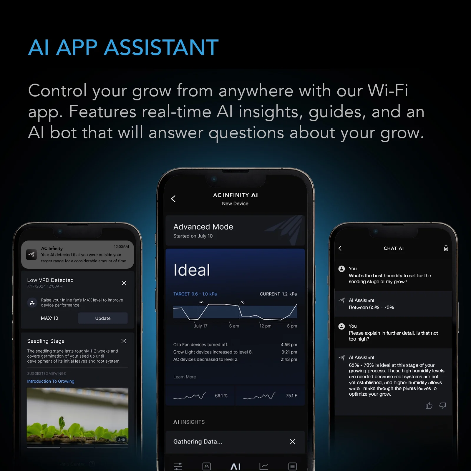 - Control your setup from anywhere via WIFI with our app, featuring real-time AI insights, guides, alerts, charts, and the ability to chat with our AI bot about your grow.
