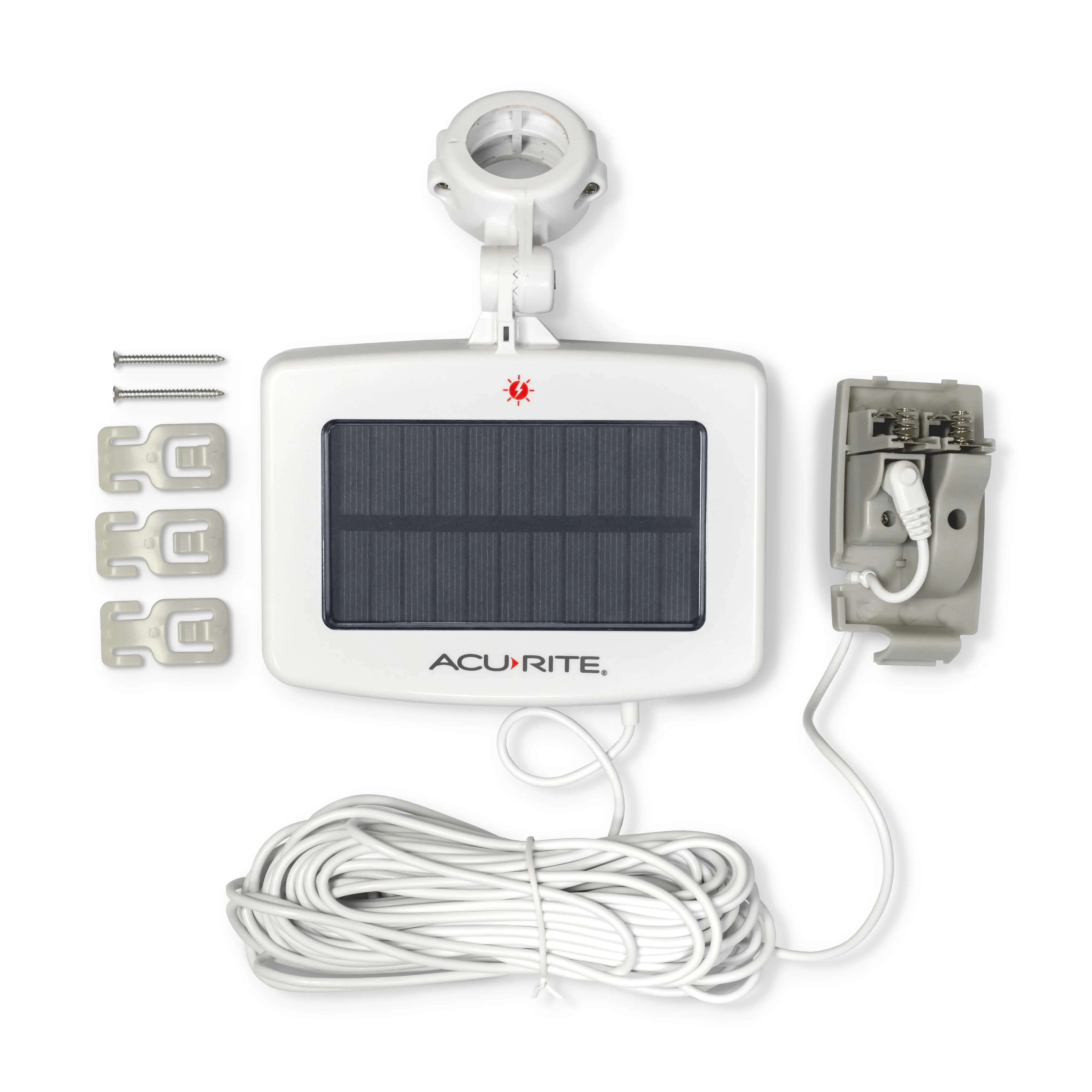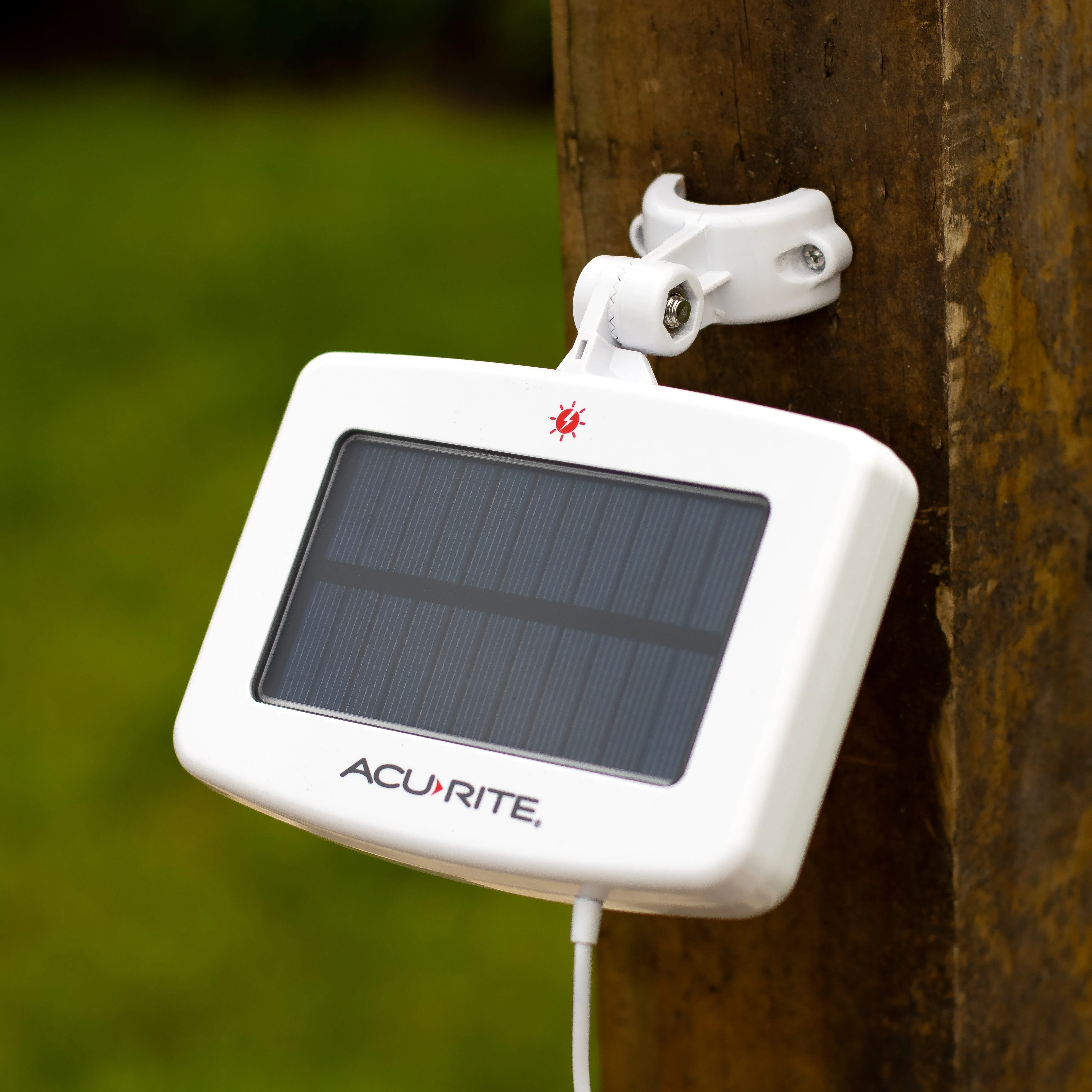 The remote weather station uses solar power to regulate internal temperature for more accurate temperature measurements, which can be sent �� along with the other weather data �� from up to 330 feet (100 meters) away using a 433 MHz wireless signal. With its auto-dim feature, the best-in-class weather display will look great in your personal weather center or rec room next to your sports ticker with its straightforward readability from almost any angle. The indoor weather station is AC powered and takes three (3) AAA batteries (not included) for optional backup in case of a power outage. The wireless outdoor sensor requires four (4) AA batteries (not included, lithium recommended for optimal performance). This weather station comes with a one-year limited warranty.