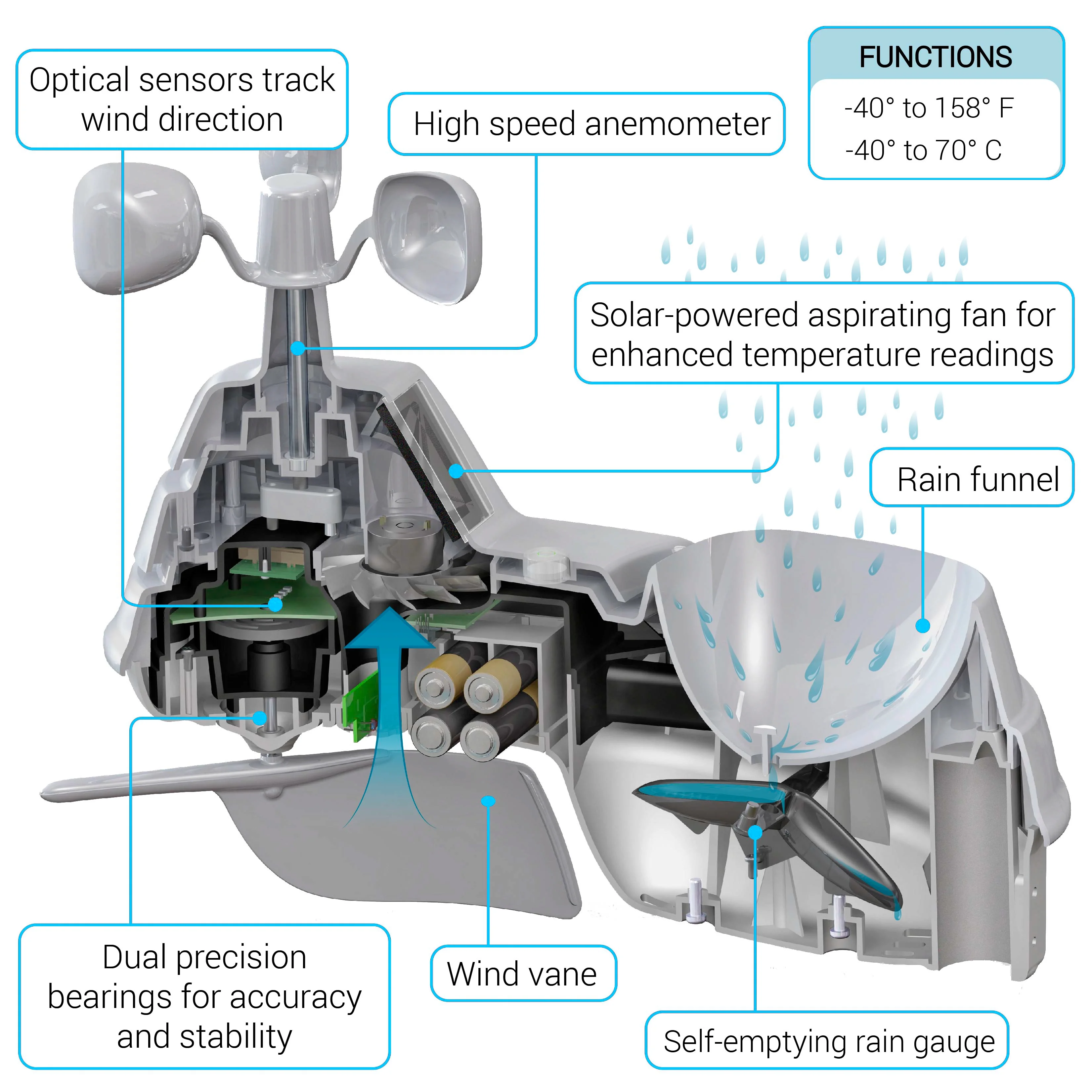 - Anemometers: Measure wind speed and wind direction, professionally tested to withstand up to 99 mph winds