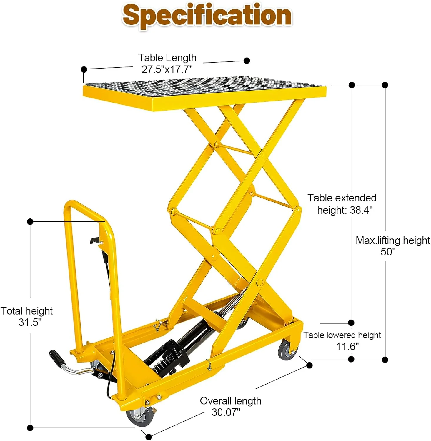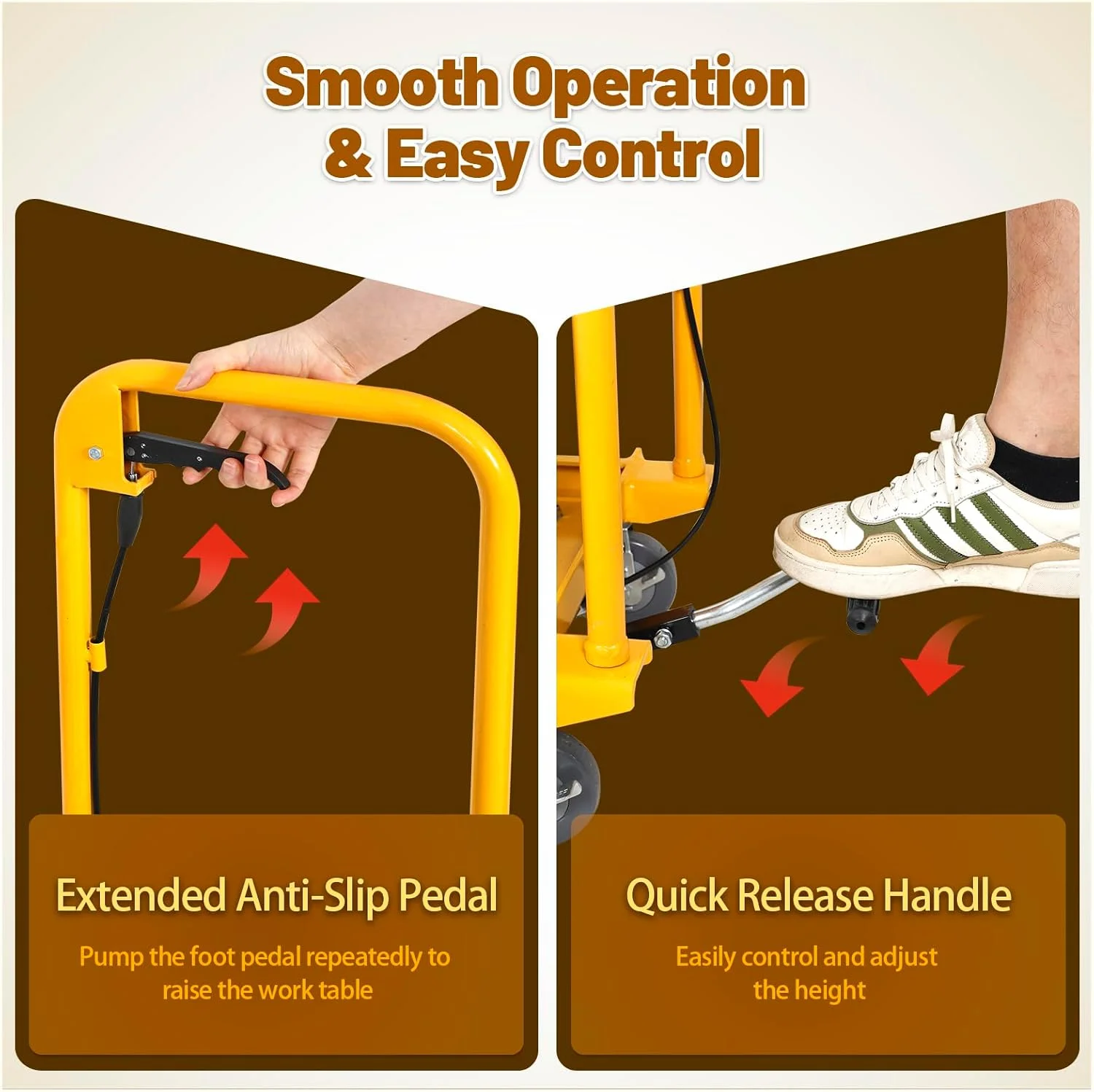 - Smooth operation hydraulic lift table with an anti-slip pedal for easy lifting (27-30 pumps) and a quick-release handle for effortless height adjustment from 11" to 50"
