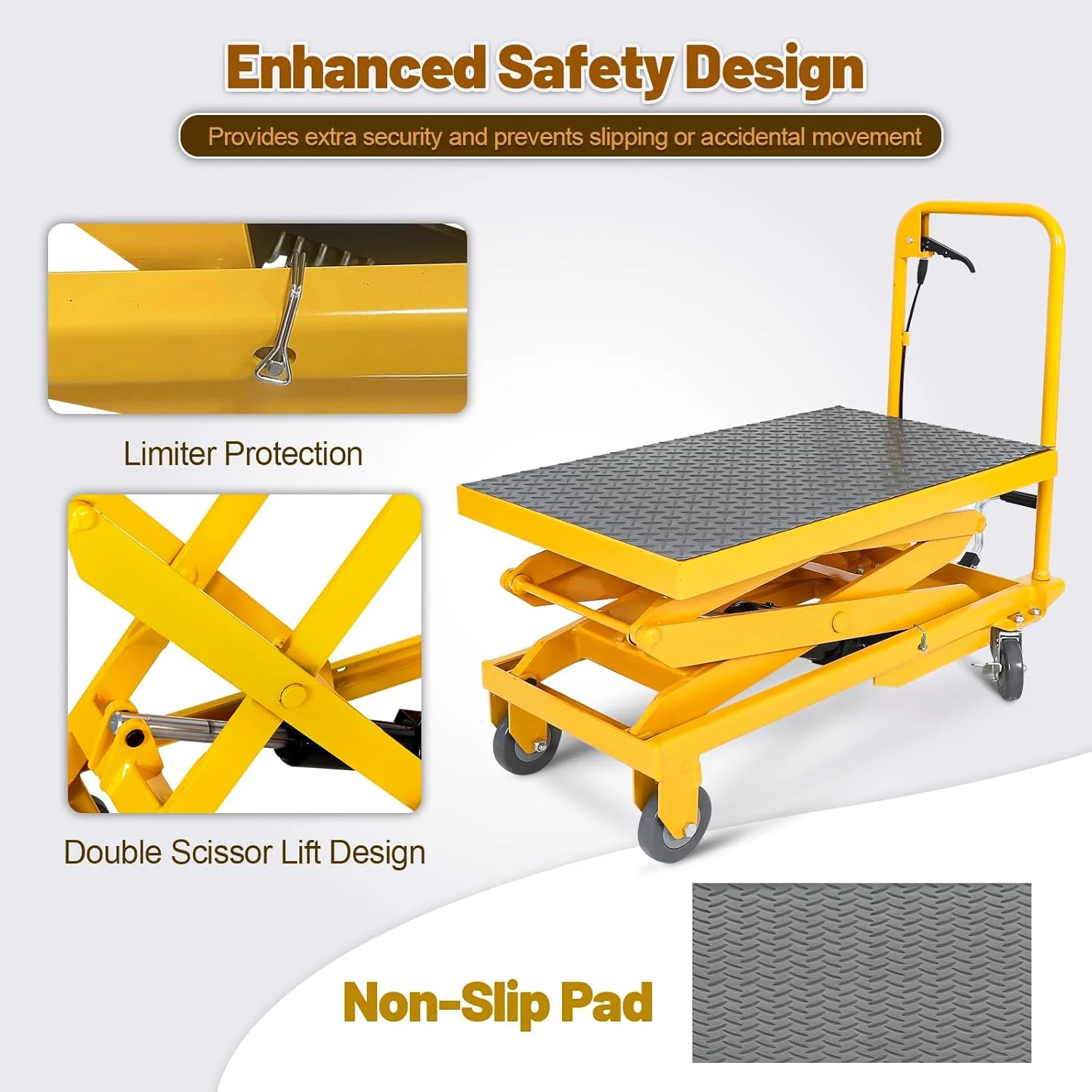 - Enhanced safety design with limiter protection, double scissor lift for stability and safety even at the maximum height, safety valves to prevent injuries, and a non-slip pad for added security
